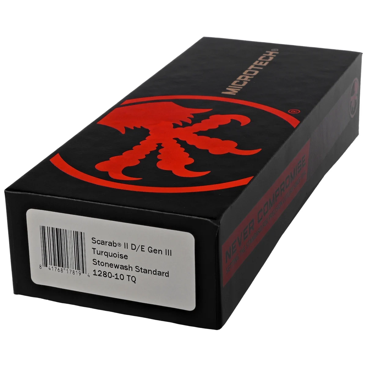 Scarab II Gen III D/E Turquoise Aluminum/3M, Stonewashed is the pinnacle of excellence in automatic tactical knives, taking inspiration from the original Microtech Ultratech design. Built to withstand the toughest conditions, the new Scarab II is the ultimate choice for heavy use. While retaining the styling features of its predecessor, it sets a new standard for OTF (Out The Front) technology.