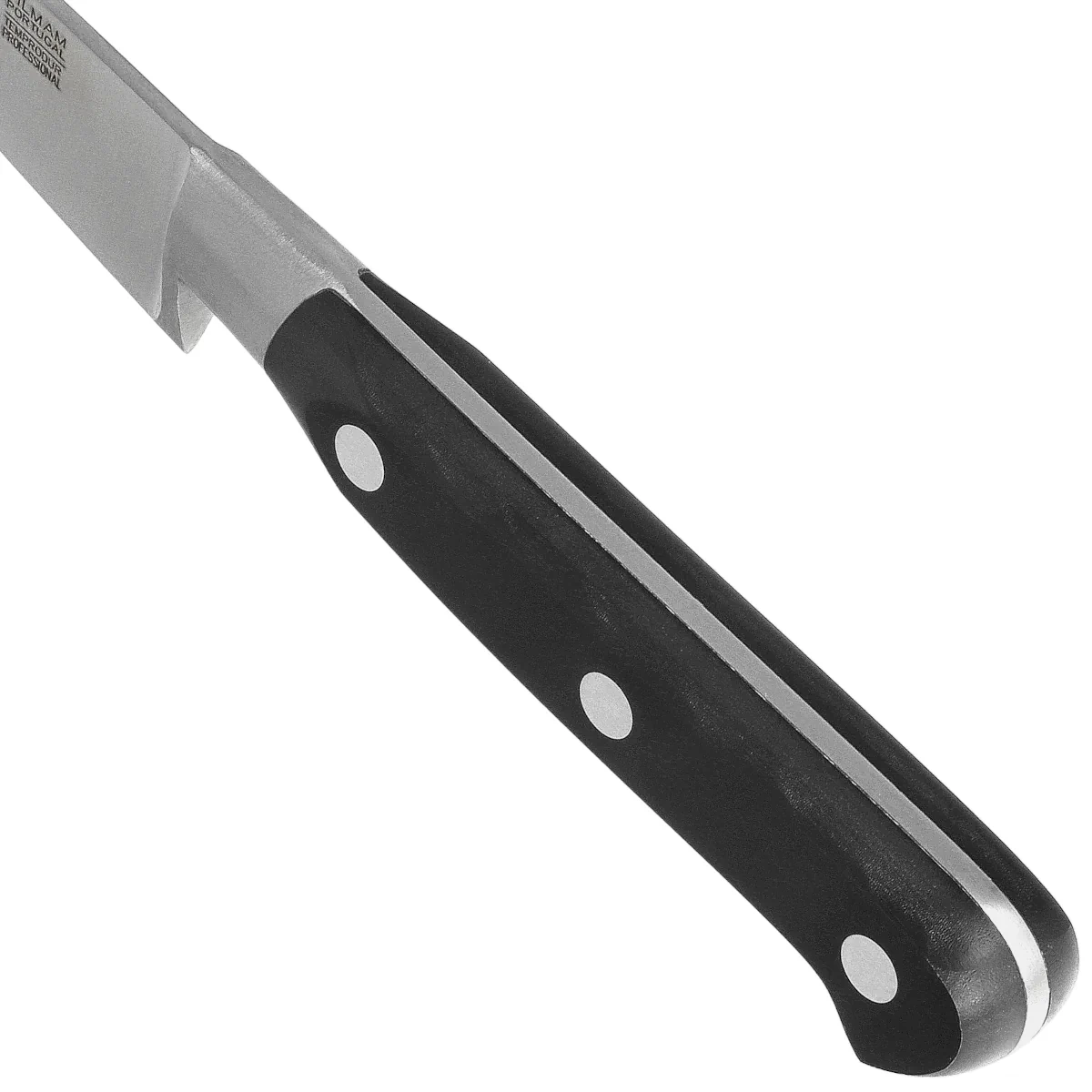 Forged Paring Black Polymer, Polished is a versatile knife with a short blade, designed for precise work with fruit, vegetables, and herbs. Offered by MAM – Filmam, Lda., it is part of a line of tools for professionals and cooking enthusiasts who value quality workmanship and ease of use. The forged X50CrMoV15 stainless steel blade provides excellent hardness, abrasion resistance and ease of maintenance. Thanks to its length and slim profile, the blade allows for precise maneuvering close to the surface of the product, which translates into minimal waste and maximum precision. The handle is made of durable POM plastic and is designed for use in demanding conditions – resistant to moisture and cleaning agents, stable in the hand, regardless of the intensity of work. The 66904 model is an indispensable auxiliary tool that combines functionality, durability, and control in a compact form.