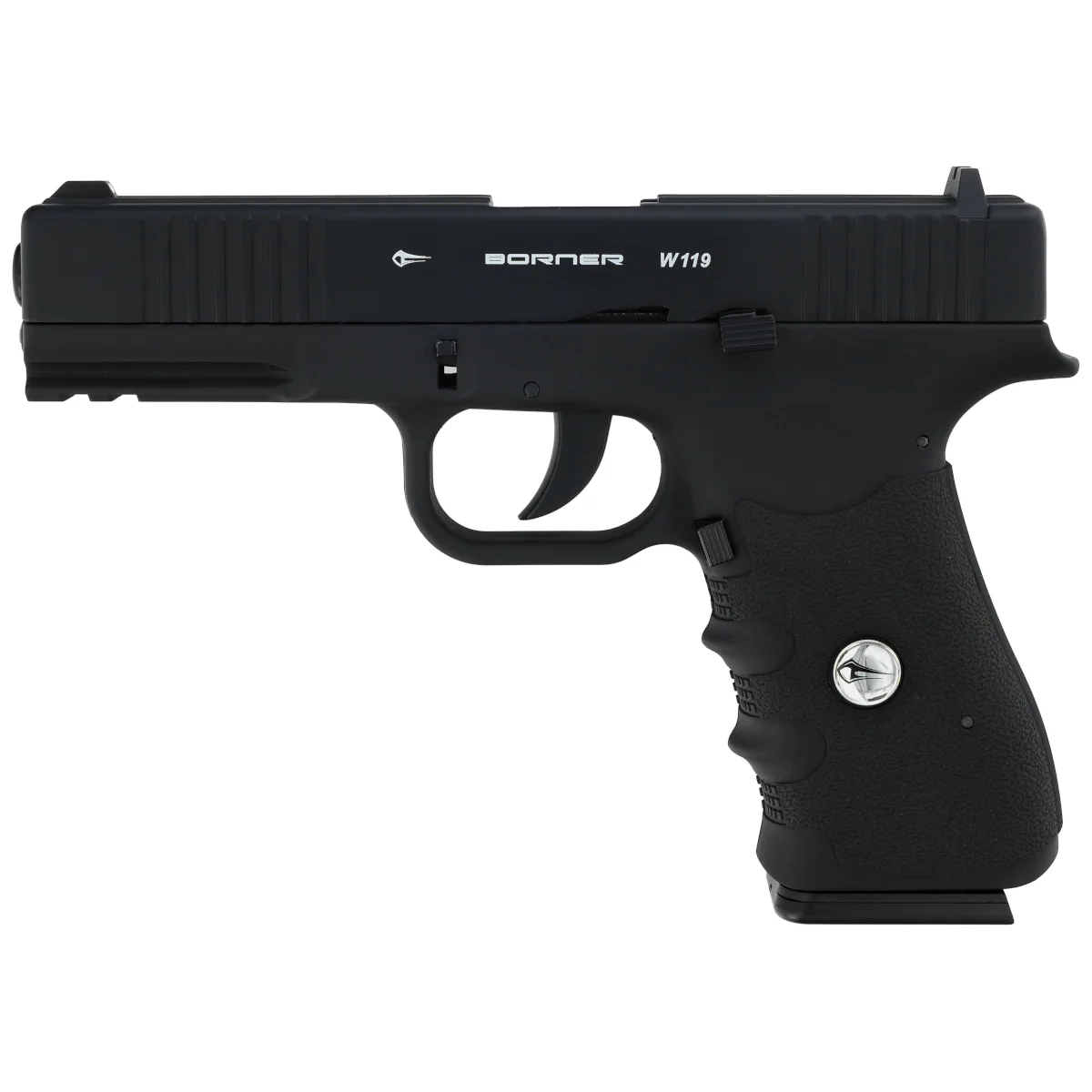 Borner W119 4.5 mm CO₂ Air Pistol is a well-crafted replica styled after the Glock 19, combining a realistic appearance with high functionality. It’s an excellent choice for those seeking a durable and affordable air pistol for recreational BB shooting.