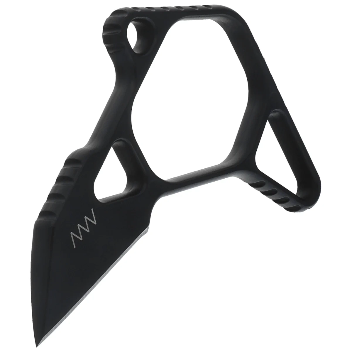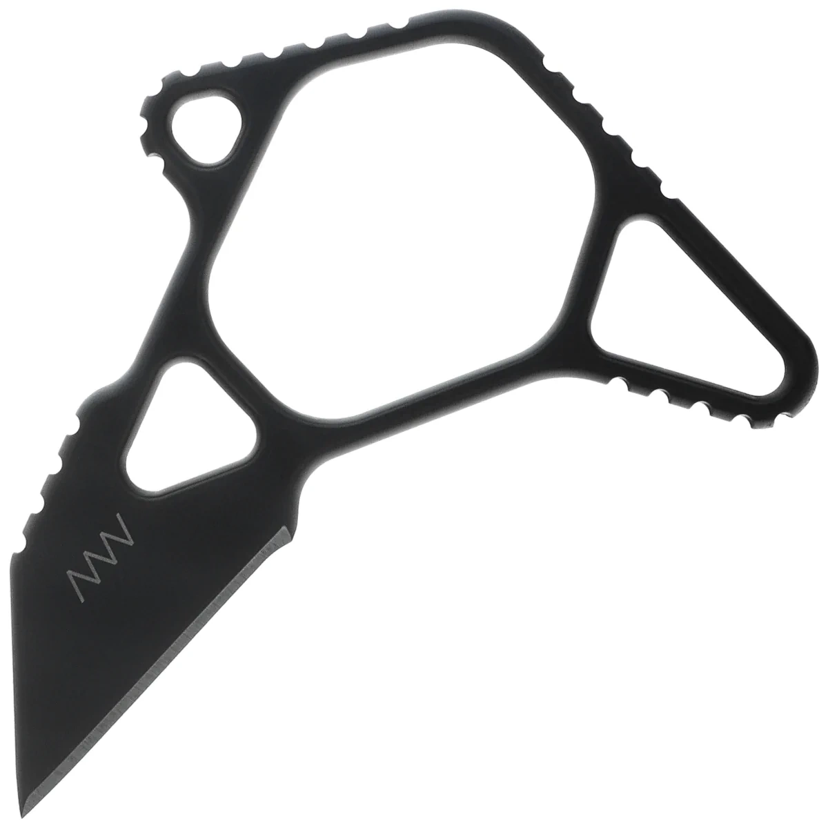 Handle - made of the same M2 steel with MIM technology , as the Blade, guaranteeing structural integrity and strength. Asymmetrical, skeletonized body with notches improves grip and minimizes weight (45 g). Finger ring allows dynamic maneuvering of the knife in an inverted position and increases control in emergency situations. Cerakote coating provides corrosion resistance and reflection masking. A cord hole provides an option for security or personalization.