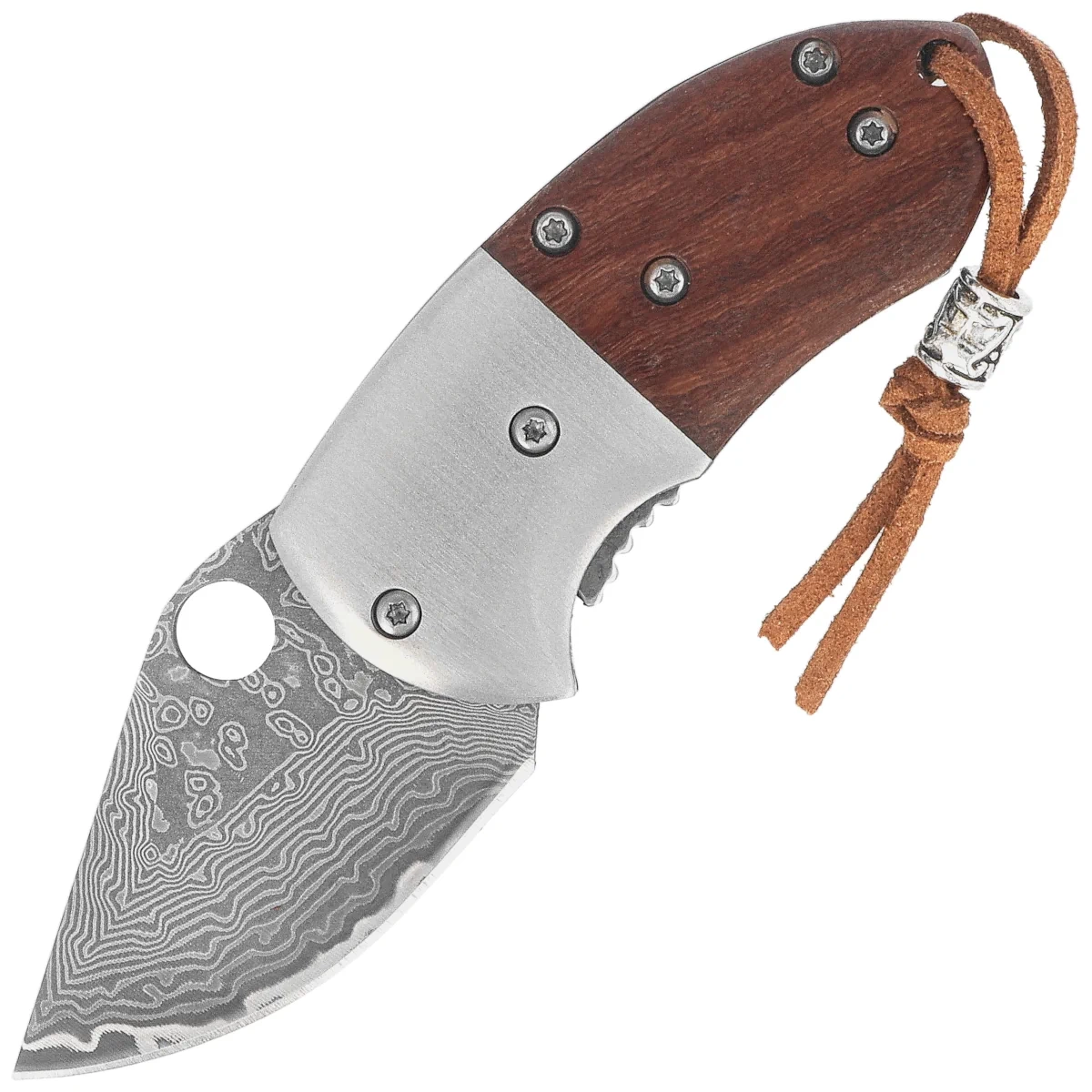 Handle - made of natural wood, whose subtle texture and color introduce an element of craftsmanship. Smooth, rounded edges provide a comfortable grip, and the precise fit with the steel body ensures stability of the design. The lack of a clip promotes a minimalist aesthetic, and a leather thong with a metal ring allows for quick attachment to a backpack or EDC kit. Compact dimensions and careful processing make the Handle perfectly complements the Blade made of damast - creating a folding knife, which combines functionality, durability and classic elegance.