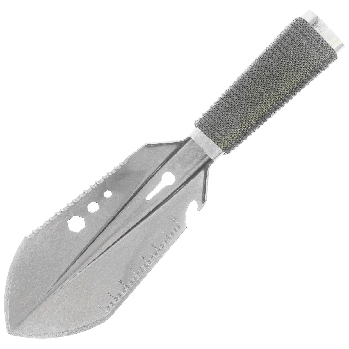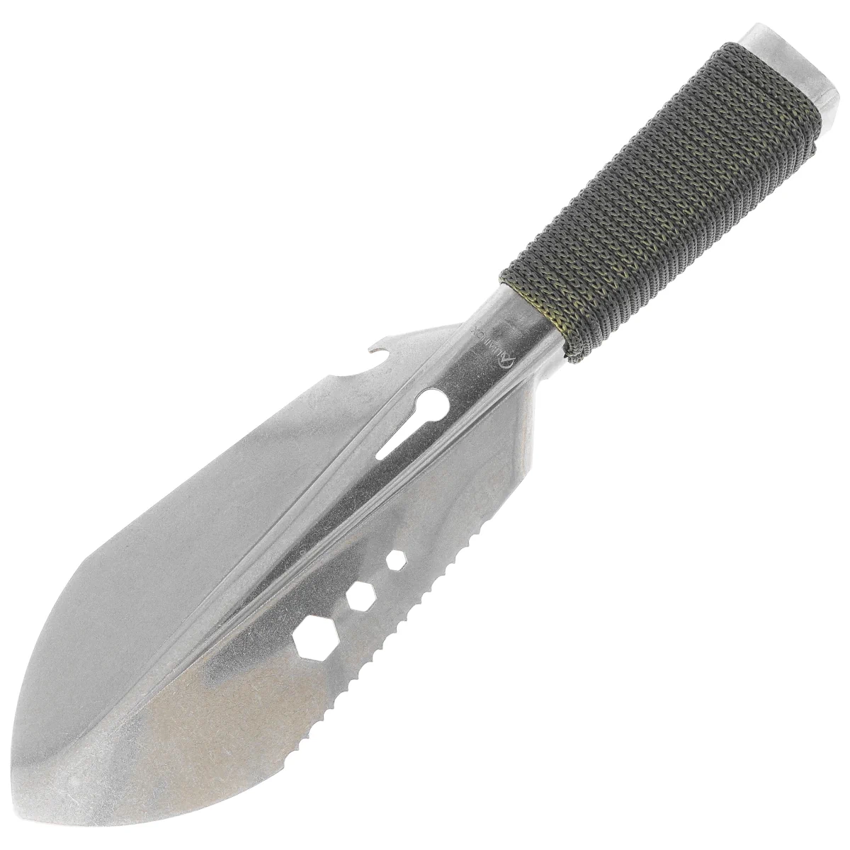 33543 Green Strung, Satin is a lightweight and handy outdoor tool designed for users who need compact equipment for field, survival, and gardening tasks. The blade is made of stainless steel for resistance to moisture and mechanical damage, while the matte satin finish gives the tool a technical look and reduces light reflection. The functional profile, including a cutting edge, a spike and a serrated section, allows for digging, cutting roots, chopping kindling and other camp work. In addition, there is a ruler, hexagonal holes for unscrewing screws, a nail puller and a bottle opener. The handle is wrapped with green nylon cord, which improves grip and can serve as an auxiliary cord in emergency situations. The set includes a camouflage nylon sheath that can be conveniently attached to a belt or equipment. The 33543 model is a tool for people who value functionality, compact size and readiness for action in all terrain conditions.
