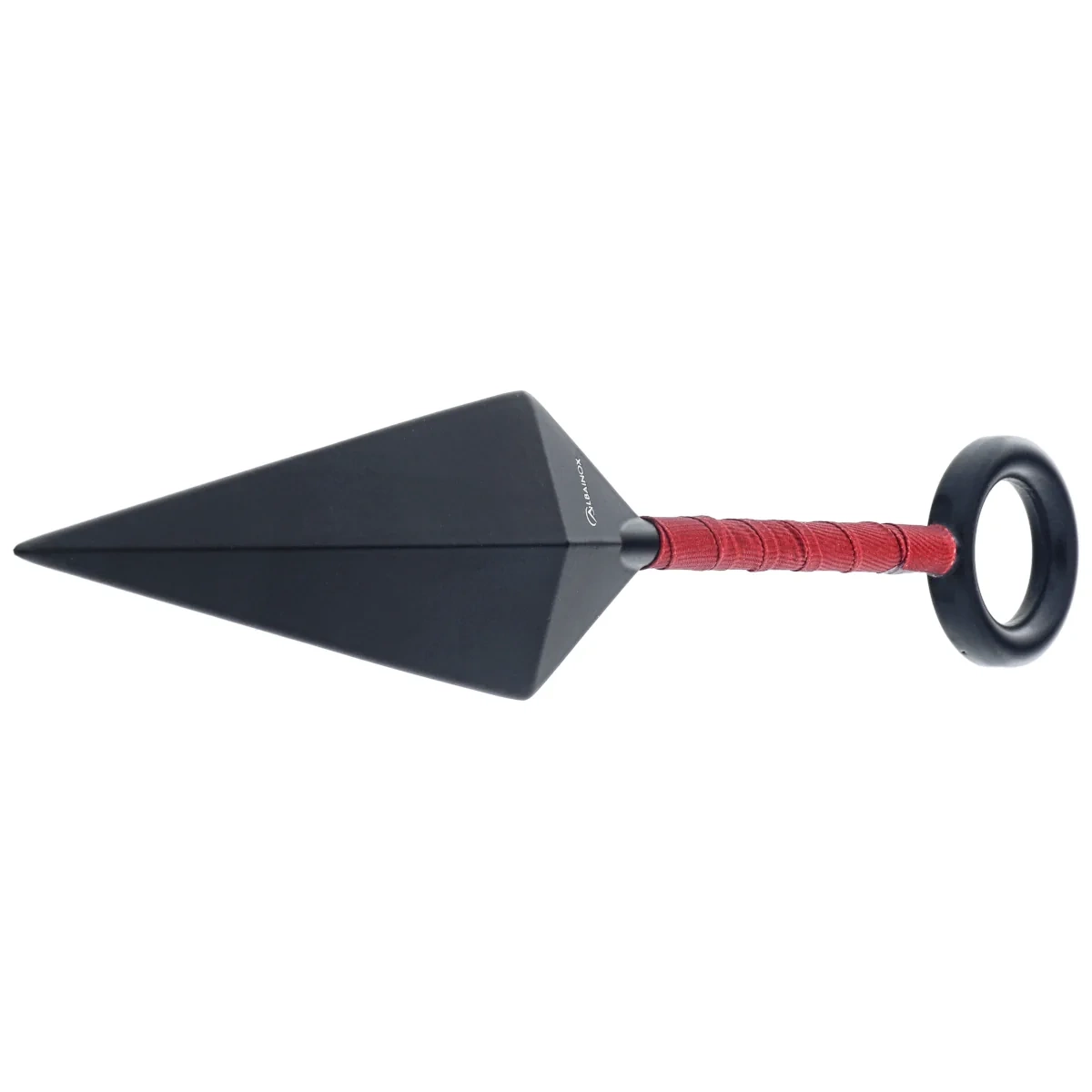 - 32678 Maroon Cord, Black Zamak – a training kunai knife made of black zamak, with a handle wrapped in maroon cord. Symmetrical, safe design for learning combat techniques and martial arts demonstrations.
