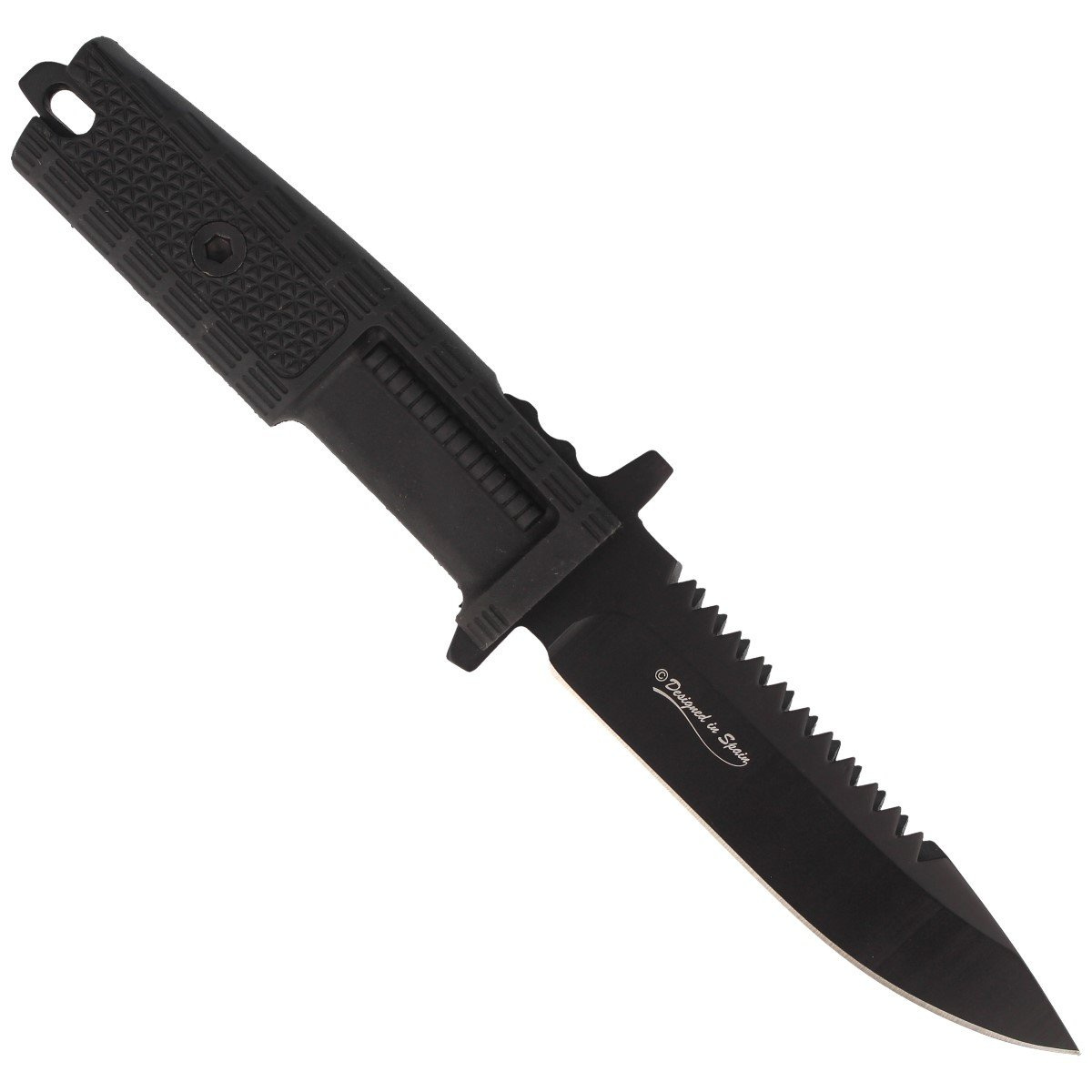 Blade - made of 7Cr17MoV steel, the head with a clip point profile combines the ability for precise cuts with effective piercing. The applied flat grind improves cutting properties, and the sawtooth on the back allows cutting wood, plastics and other hard materials. The black titanium coating increases abrasion and corrosion resistance and eliminates light reflections, emphasizing the tactical nature of the tool. An additional steel crossguard serves as a safety feature, especially important for intensive work. The blade's geometry was selected to support operations in harsh environments - both in EDC situations and during field work.