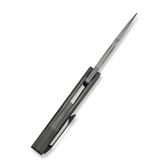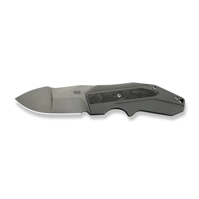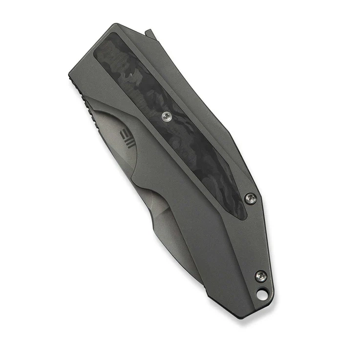 Handle - made of milled titanium 6Al-4V, providing high rigidity, mechanical resistance and lightness. The main panels are enriched with inlays of a unique composite Marble Carbon Fiber, offering a three-dimensional optical effect and increased surface grip in all conditions. Gentle edge profiling and ergonomic finger undercuts promote comfort and control, even during prolonged use in off-road or EDC environments. The design is reinforced by a precision-fitted backspacer and a deep-carry tip-up clip , allowing the knife to be carried discreetly and steadily in a pocket. The entire design is maintained in a sleek, minimalist aesthetic, combining modern engineering with the superior workmanship typical of Cecchini's designs in the premium WeKnife line.