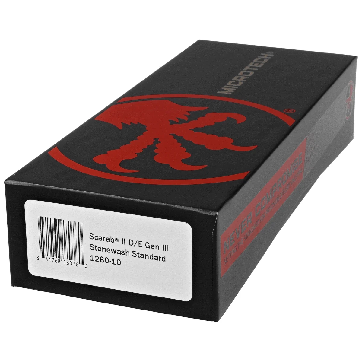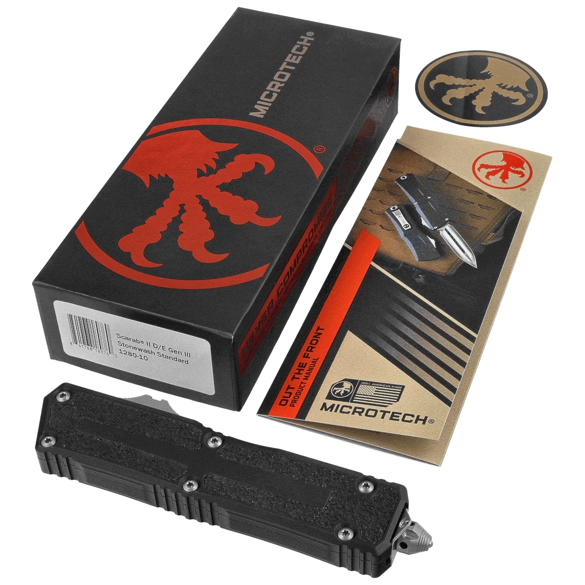 Scarab II Gen III D/E Black Aluminum/3M, Stonewashed is the pinnacle of excellence in automatic tactical knives, taking inspiration from the original Microtech Ultratech design. Built to withstand the toughest conditions, the new Scarab II is the ultimate choice for heavy use. While retaining the styling features of its predecessor, it sets a new standard for OTF (Out The Front) technology.