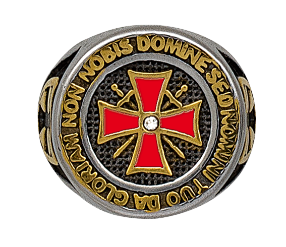 - Templar Seal Ring Ø21, ring with a red isosceles cross on a background of crossed swords, surrounded by the motto of the Templars: “Non nobis Domine, sed nomini tuo da gloriam”. Contrasting finish in shades of silver, black and gold. Diameter: Ø21 mm.