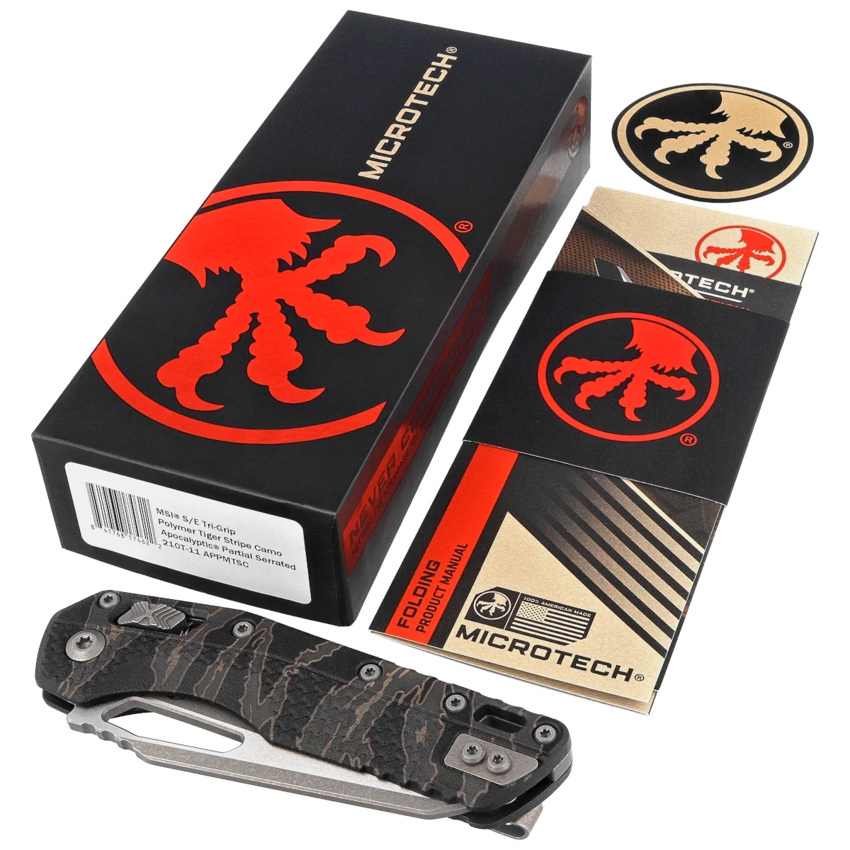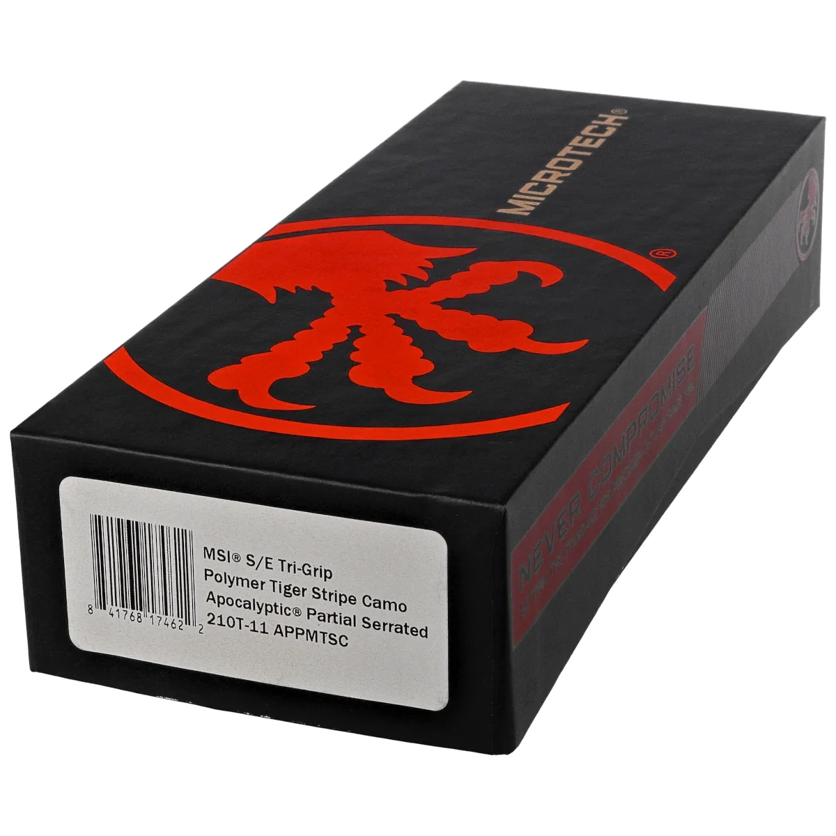 Microtech MSI S/E Ram-Lok Tiger Stripe Camo Tri-Grip Polymer, Apocalyptic P/S M390MK by Tony Marfione (210T-11APPMTSC)