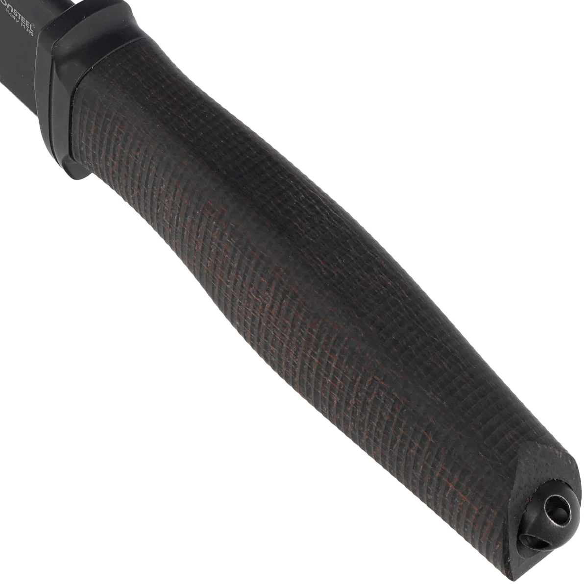 Blade - designed for durability, precision and high operational resistance. Made of Böhler M390 powder steel , the Blade offers excellent cutting performance, long-lasting sharpness retention and corrosion resistance - even in environments exposed to moisture and dirt. The drop point profile provides versatile performance, and the long, smooth cutting edge works well for a wide range of utility work. The flatgrind gives the blade a low cutting resistance and optimal working thickness, which is conducive to both precision operations and more strenuous tasks. The surface of the blade was finished using the Stonewashed method and then coated with a black coating that reduces glare and masks microscratches, while enhancing the knife's aesthetics. The integral titanium crossguard not only makes the knife safer to work with, but also strengthens the structure of the entire design.