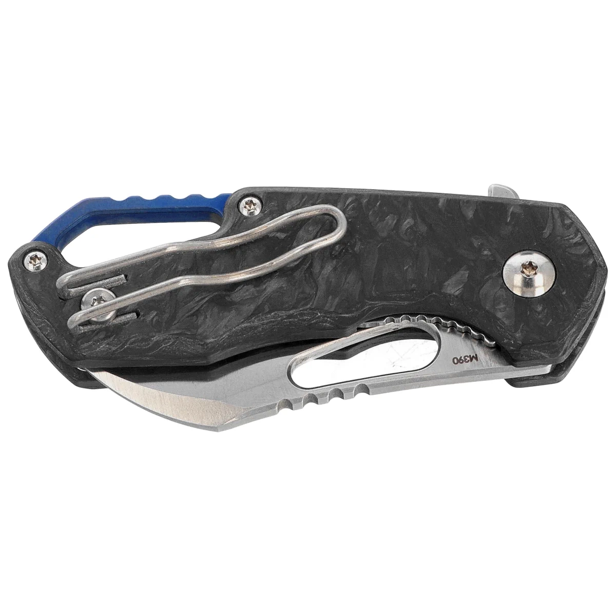 Handle grips - CNC-milled Marbled Carbon Fiber plastic with a unique marbled look. Bolted to a carbine-shaped backspacer, deeply textured for improved grip. The backspacer and the decorative ring around the pivot, the so-called pivot collar, are made of blue anodized titanium. A two-position left/right compact deep-pocket wire clip allows the knife to be carried in tip-up position (blade tip up).