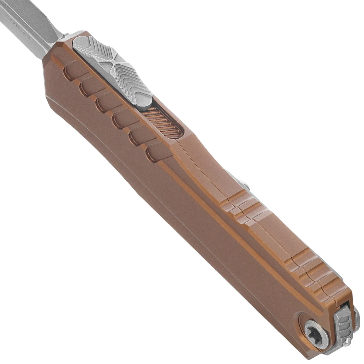 - Cypher 2 D/E Tan Aluminum, Apocalyptic the result of a collaboration between Deryk Munroe and Tony Marfione has undergone a comprehensive upgrade. An innovative dual blade drive mechanism provides smoother operation than ever before in OTF knives.