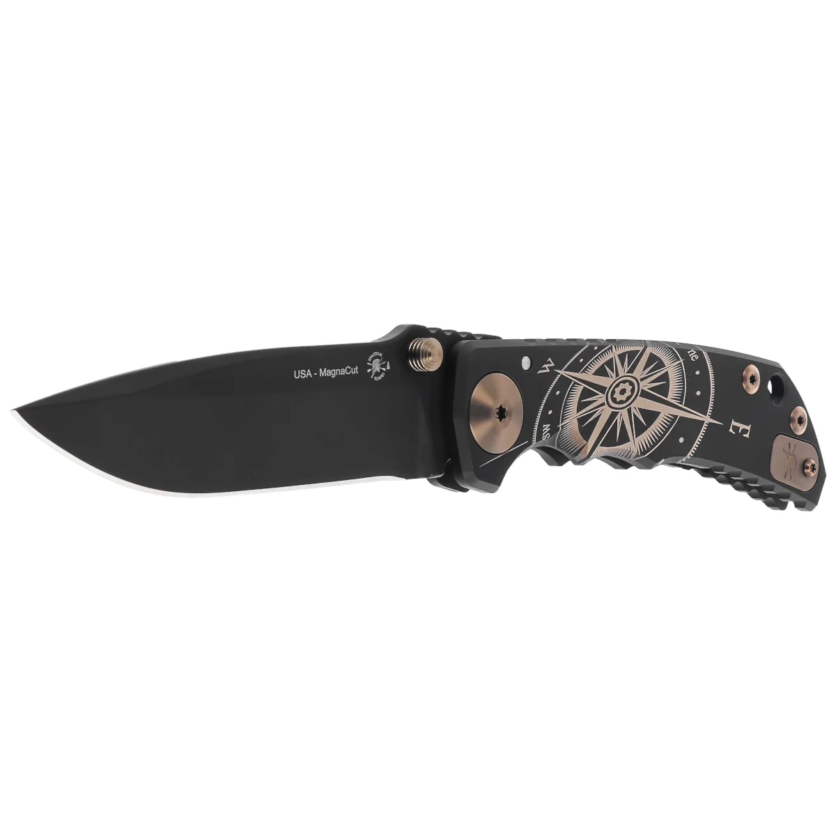 • Spartan Harsey Folder S.E. Golden Compass Black Titanium, Bronze HW, Black, limited edition large tactical folder designed by knifemaking legend Bill Harsey. Ergonomic titanium handle decorated with engraving, Blade made of MagnaCut steel.