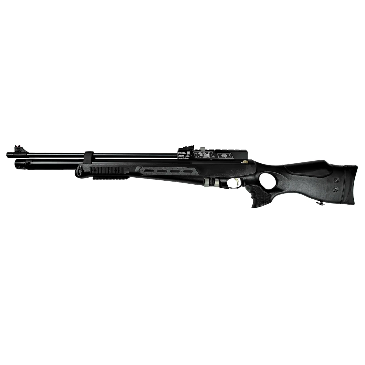 Barrel – precision-rifled 23" (585 mm) barrel by Hatsan Arms, ending in a threaded ½" UNF muzzle for attaching a sound suppressor, muzzle brake, or air stripper. The barrel is choked at the muzzle to improve shot grouping. Barrel quality is a critical factor for any rifle, greatly affecting accuracy—especially over long distances.