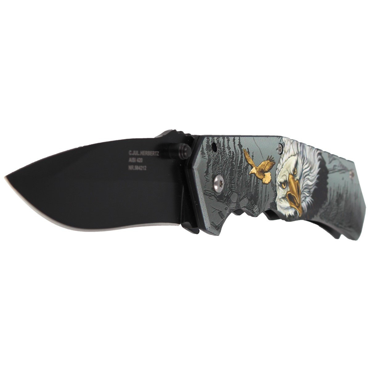 - Herbertz CJH 3D Eagle, Black - a folding utility knife with a 420 stainless steel drop point blade with black coating and a metal handle with decorative eagle graphics. 3D aesthetics and functionality in a rugged EDC design.