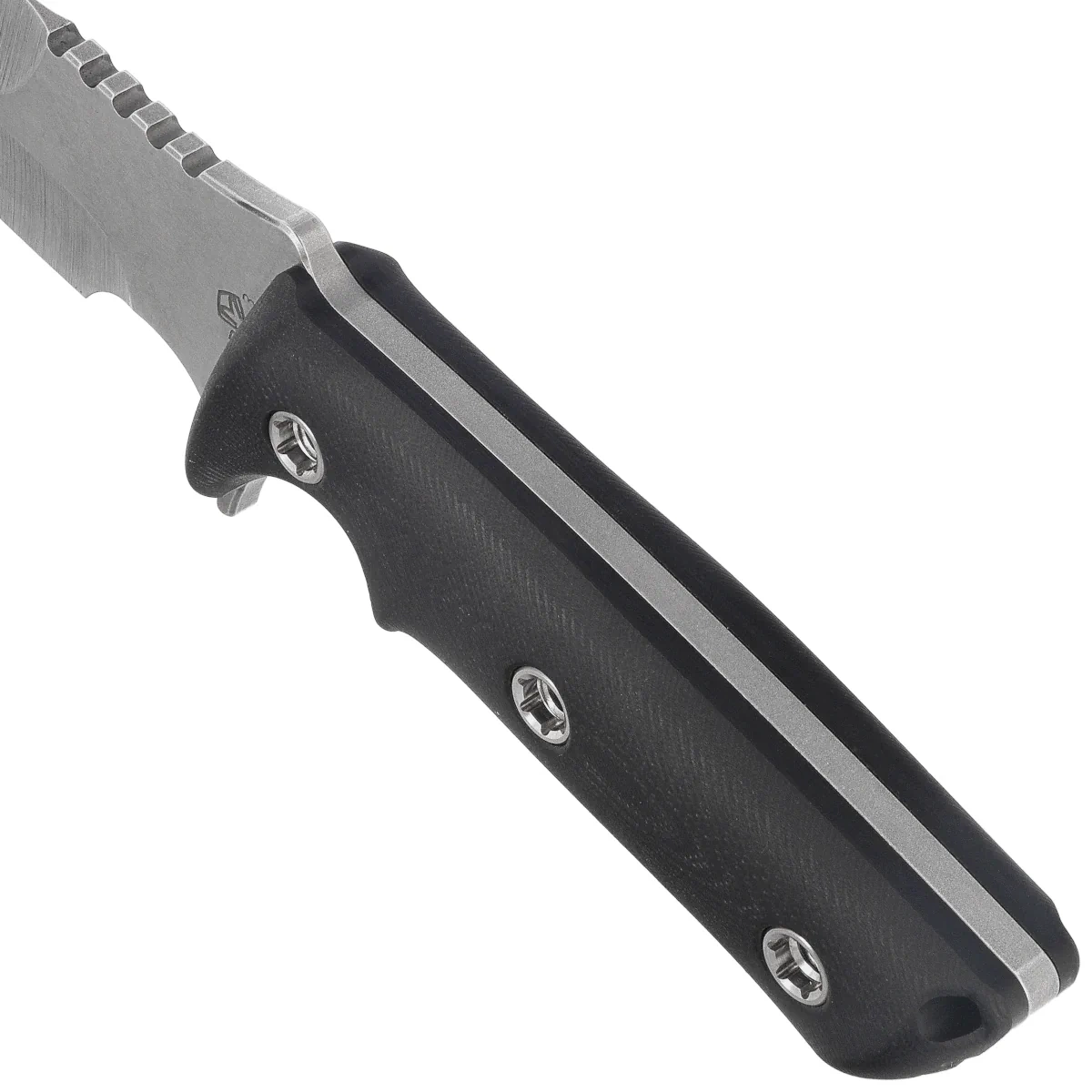 Handle - made of black G10 provides excellent resistance to weather and mechanical damage. Its milled surface and ergonomic shape allow a secure grip in all conditions - regardless of whether the user has wet hands or wears gloves. Three screws solidly fasten the grips to the mandrel, eliminating any play. In the back of the Handle there is a hole for a rope, allowing to secure the knife during field operations. The whole is complemented by a plastic sheath with Tek-Lok mounting, guaranteeing quick access and stable attachment.