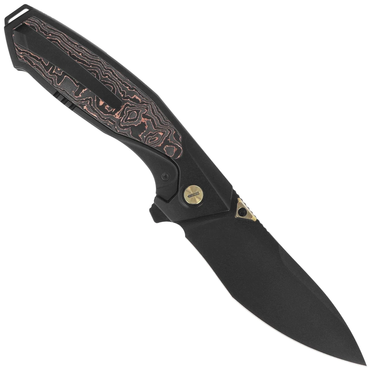 Handle - made of milled titanium 6AL4V, provides a solid base for a slim and durable design. Copper Carbon Fiber composite inserts improve the grip and emphasize the modern character of the design. The Handle has been contoured to provide comfort and control even during prolonged use - the ergonomic ribbing naturally fits the hand. The whole is complemented by an integrated backspacer which, when removed, can be used to unscrew the pivot screw, and a deep carry clip, which allows low-profile and secure carry. Handle design is a thoughtful balance between aesthetics and practicality, meeting the needs of experienced EDC users.