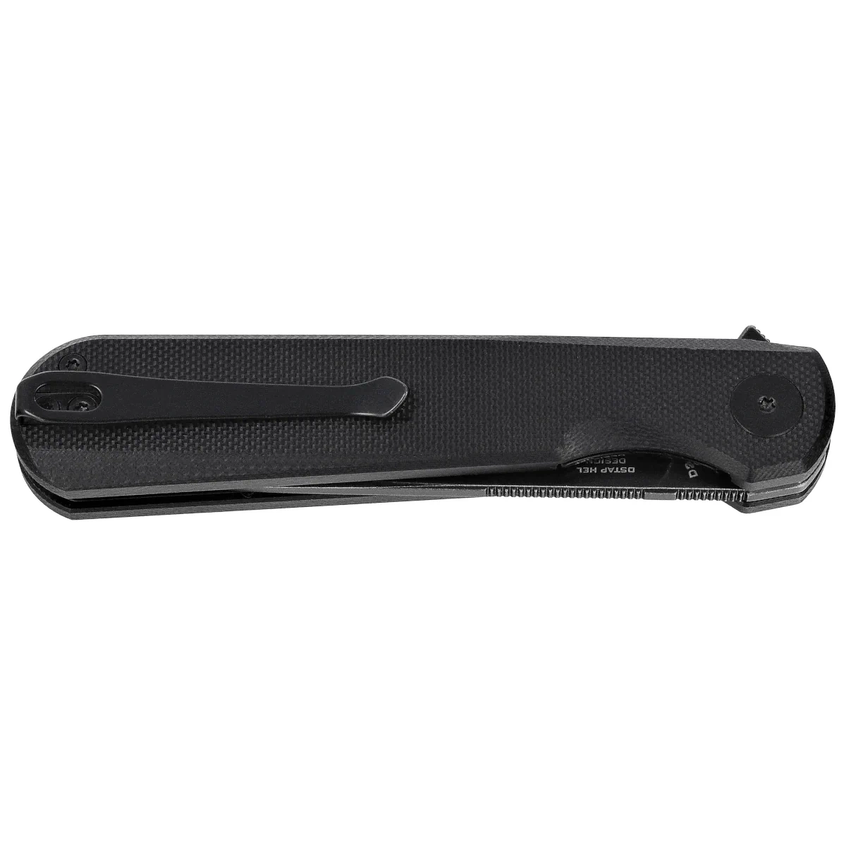 - Flick Black G10, Black Stonewashed, an EDC folding knife designed by Ostap Hel, with a drop point blade in D2 tool steel and a G10 composite handle. Liner lock, styling based on principles of utility geometry.