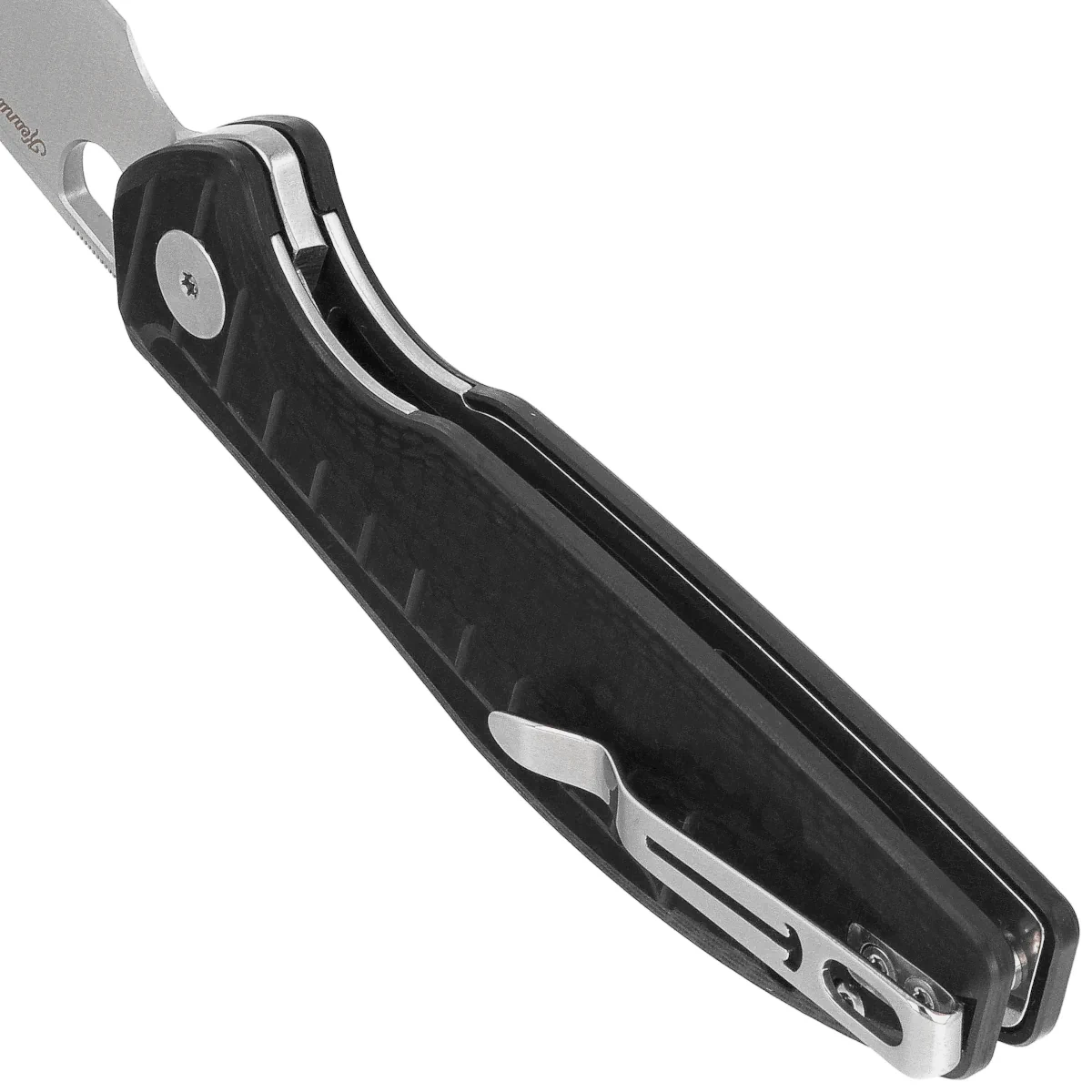 Handle - made of G10 composite guarantee lightweight, high strength and secure grip even in wet conditions. Textured surface improves grip without causing excessive wear. Button lock ensures easy locking and unlocking of the blade, while the blade opening promotes quick opening. A reversible deep carry clip allows discreet carrying, while a lanyard hole enhances attachment options. Ergonomically shaped handle provides comfort during prolonged use.