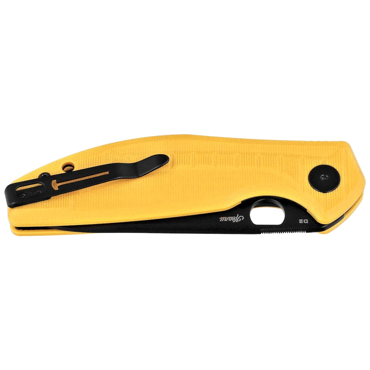 - Angry Owl Yellow G10, Black PVD - compact EDC knife designed by Keanu Alfaro, with Blade made of D2 tool steel, button lock mechanism and thumb hole for opening. Distinctive handle made of durable G10 composite.
