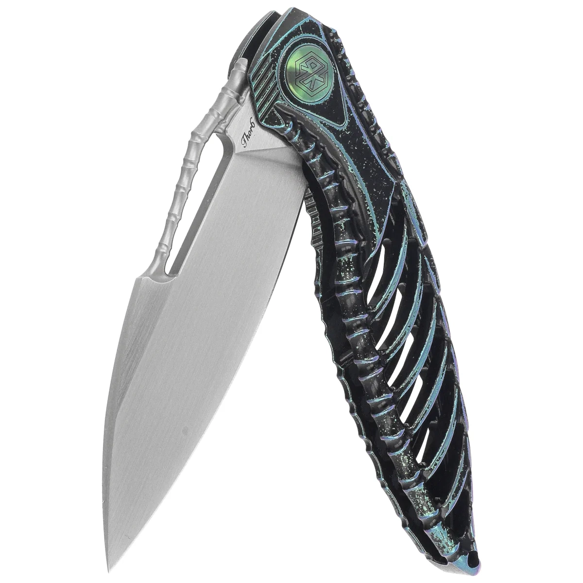 - Thor6 Black / Green Titanium, Satin - a futuristic premium folding knife with a titanium Integral Handle and M390 steel Blade, combining biomechanical aesthetics with EDC functionality. Artistic form and technical precision in one.