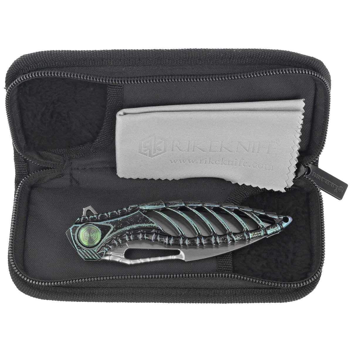 Thor6 Black / Green Titanium, Satin by Rike Knife is an expression of a bold design vision in which engineering discipline meets aesthetics inspired by biomechanics and organic forms. Created from a single block of titanium, the Handle's body has been precision-milled and anodized in shades of black and purple, creating a dynamic, sculptural structure reminiscent of an exoskeleton or mechanical architecture. This model was created for design enthusiasts, for whom a knife is not only a tool, but also a style manifesto. At the center of the composition is a Blade made of Böhler M390 steel, known for its exceptional abrasion resistance and long-lasting sharpness retention. Its spear point profile and satin finish emphasize precision and culture, while the integrated notch on the blade allows for easy one-handed opening. The Handle is distinguished by a skeletonized design that significantly reduces weight, improves ventilation and increases rigidity. Ribbing, asymmetrical embossing and a decorative pivot work together to create a sophisticated utility and aesthetic form. The model is equipped with a deep carry clip and a lanyard hole, which facilitates discreet and safe carrying. Thor6 is for collectors and users who do not accept compromises - a tool with high performance, unique design and flawless execution.