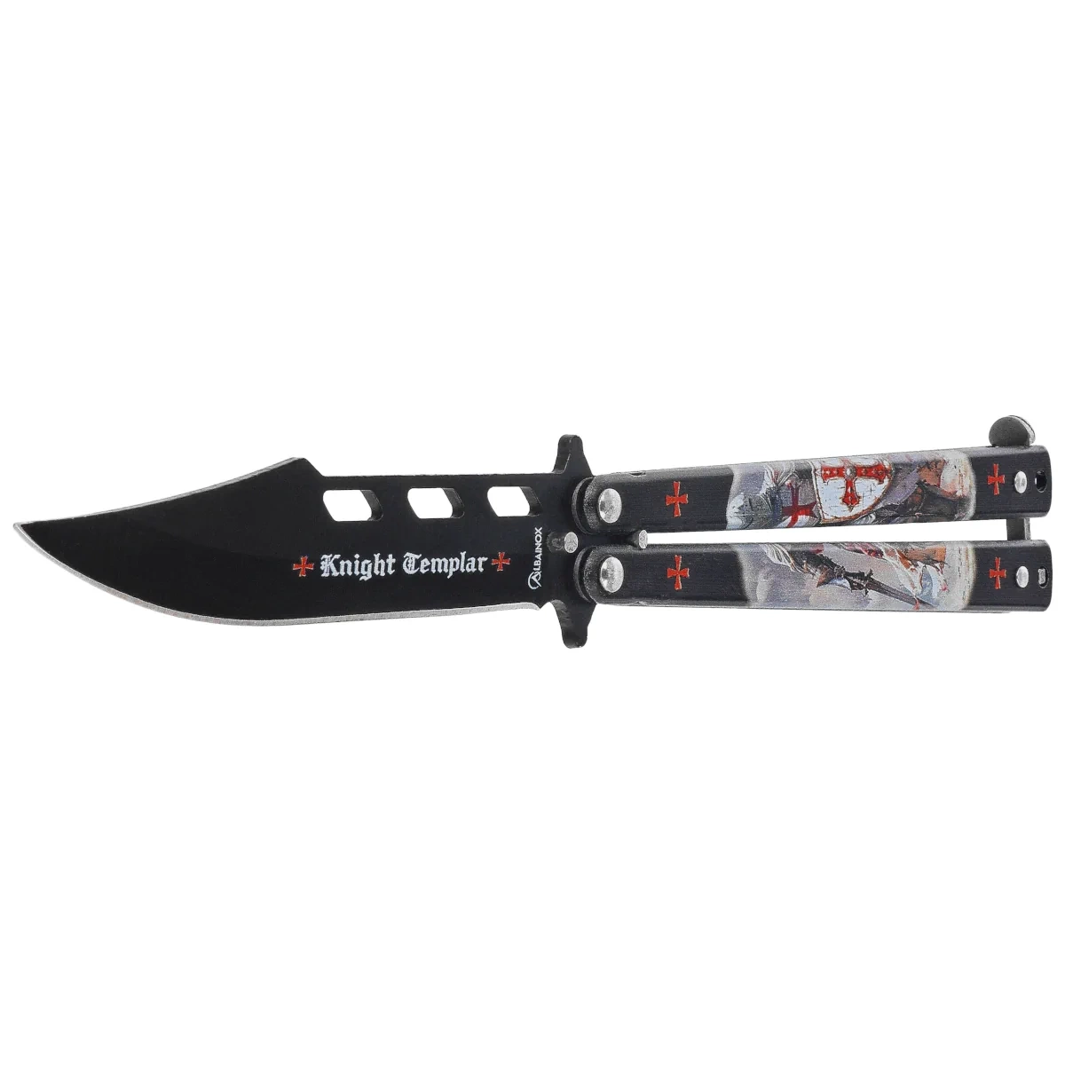 Balisong Black Templar 3D Design Steel, Black is a distinctive folding knife of the balisong type, the design of which refers to medieval knightly orders. The entire surface is covered with a three-dimensional print depicting the Knights Templar in white cloaks with a red cross - this motif takes the knife from the level of a utilitarian tool to the rank of an aesthetic artifact. It's a design that finds itself perfectly in the role of a show knife, but will also work well for simple everyday tasks. Blade with dynamic lines has been juxtaposed with decorative perforations, and the black coating enhances the striking design. The whole was designed for users who appreciate original design and precision workmanship. The opening mechanism based on a classic arm arrangement ensures smooth operation and symmetrical handling. It is an offer for collectors, fans of spectacular designs and enthusiasts of fantasy knives with historical aesthetics.