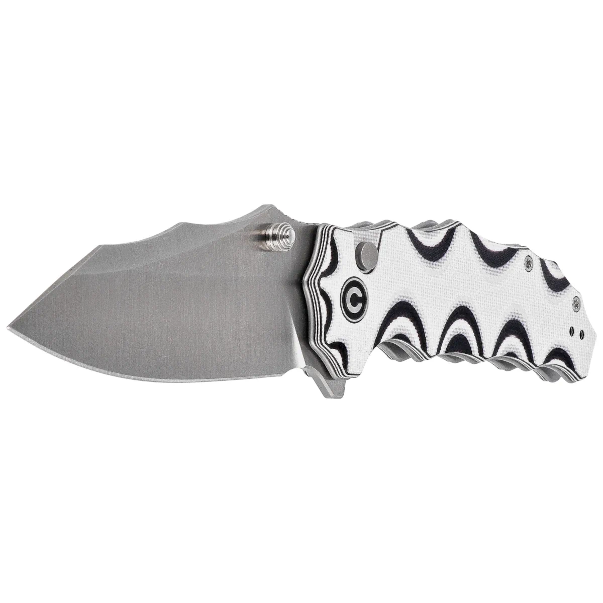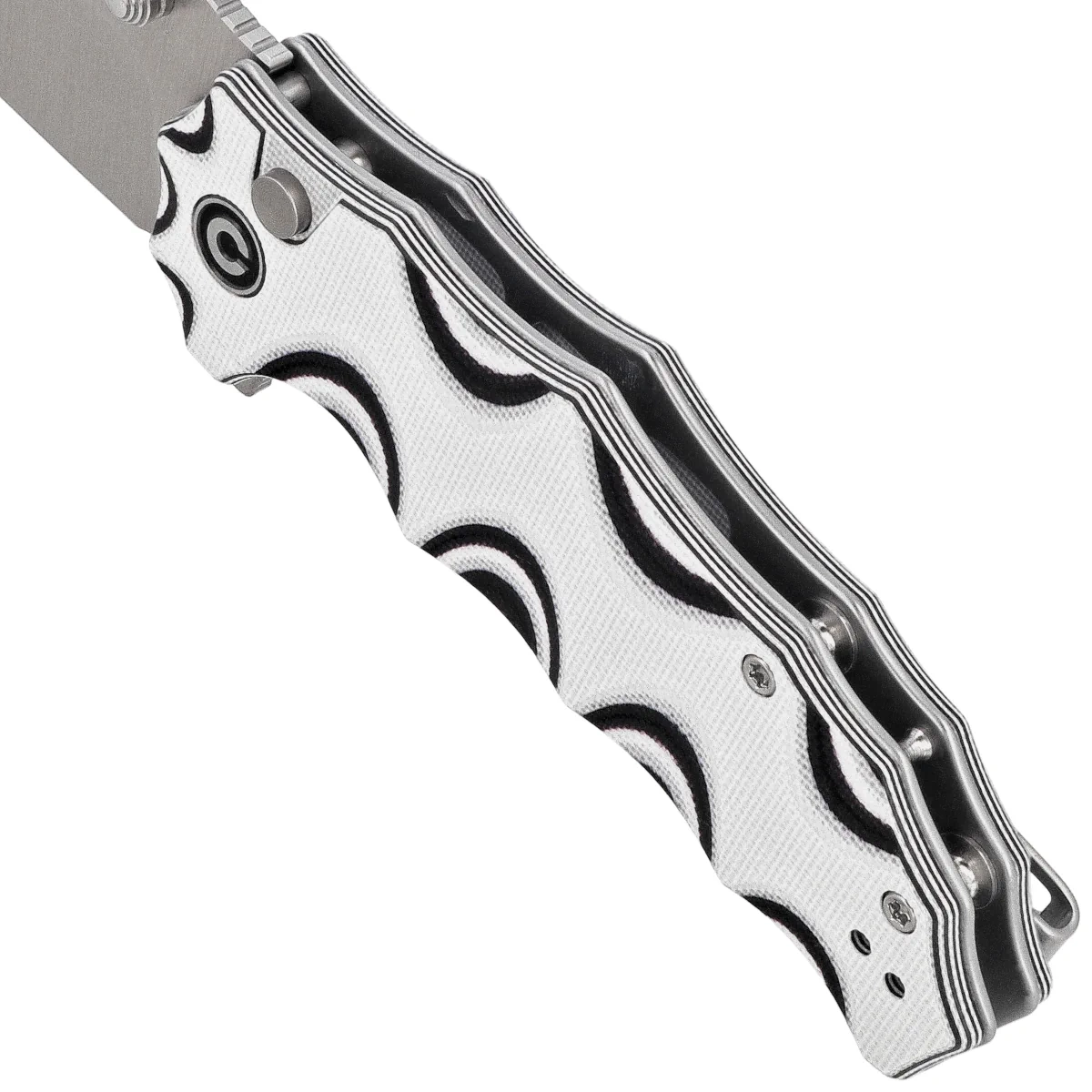 - Natterjack White / Black G10, Satin, rugged EDC knife with a clip point blade made of 14C28N steel and a contoured G10 handle. The button lock mechanism, flipper and thumb stud guarantee quick, convenient access to the blade in any situation.