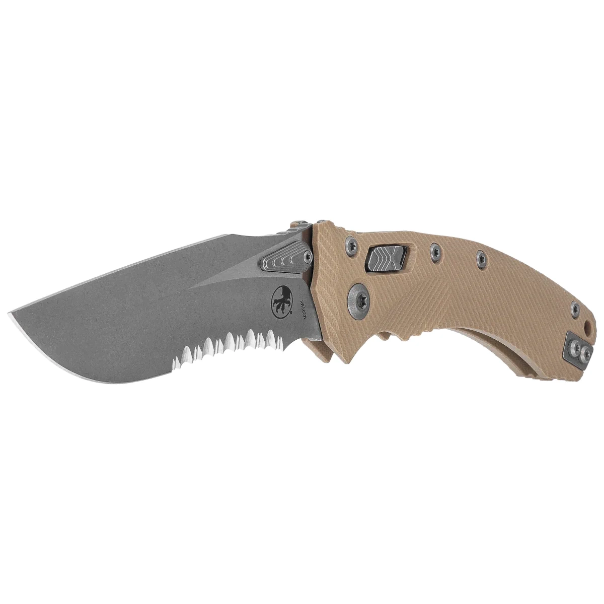 Handle - made of durable G10 composite, for better grip covered with milled lines(Fluted). Wide locking slide with Microtech's characteristic stepped X structure . Both grips have been screwed together with a solid backspacer. A double-sided (right / left) titanium clip allows you to discreetly carry the knife in tip-up position. Above the clip a lanyard hole, a place for a safety or decorative cord.