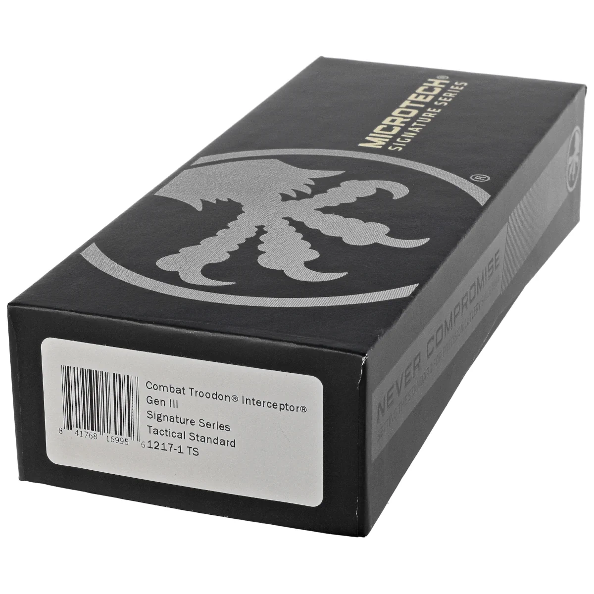 Combat Troodon Gen III Interceptor Signature Black Aluminum, Tactical this largest of the automatic knives is the pinnacle of precision engineering and tactical prowess in the field of OTF (Out The Front) knives. Built for a wide range of utility applications, it boasts a 25% larger size compared to the flagship Troodon. Precisely crafted with a sophisticated and hellishly fast ejection mechanism for the razor-sharp new type of blade - the Interceptor. 100% made and assembled in the USA. Designed by Anthony Marfione, knifemaker and owner of Microtech Knives.