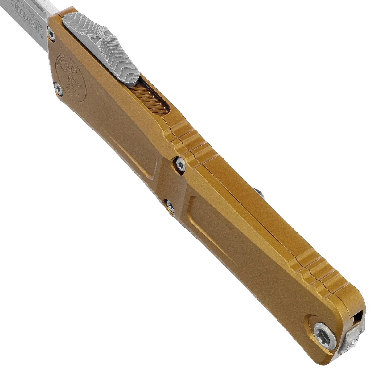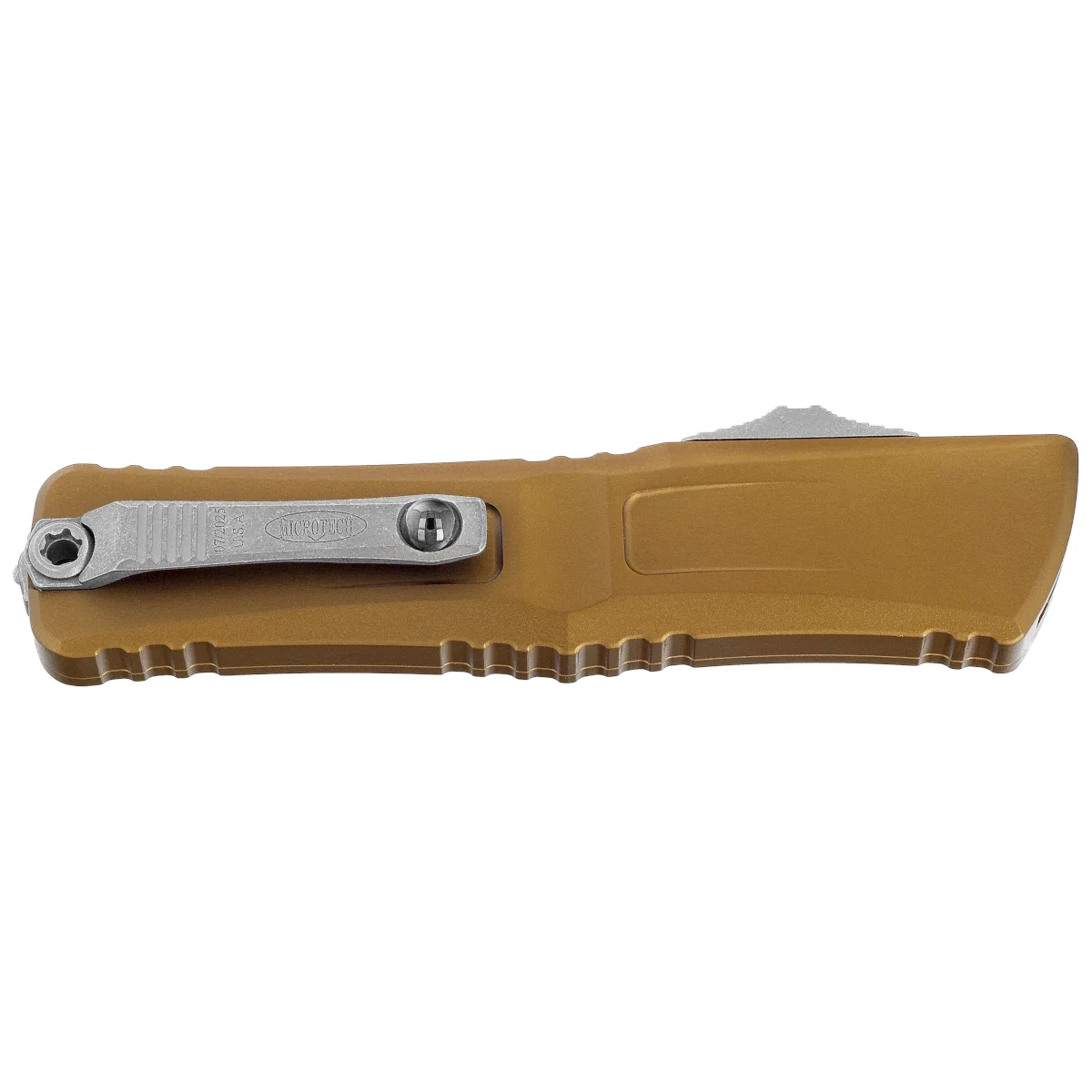 Combat Troodon Gen III S/E Tan Aluminum, Apocalyptic this largest of the automatic knives is the pinnacle of precision engineering and tactical prowess in the field of OTF (Out The Front) knives. Built for a wide range of utility applications, it boasts a 25% larger size compared to the flagship Troodon. Precisely crafted, it features a sophisticated and hellishly fast mechanism that extends the razor-sharp blade. 100% made and assembled in the USA. Designed by Anthony Marfione, knifemaker and owner of Microtech Knives.