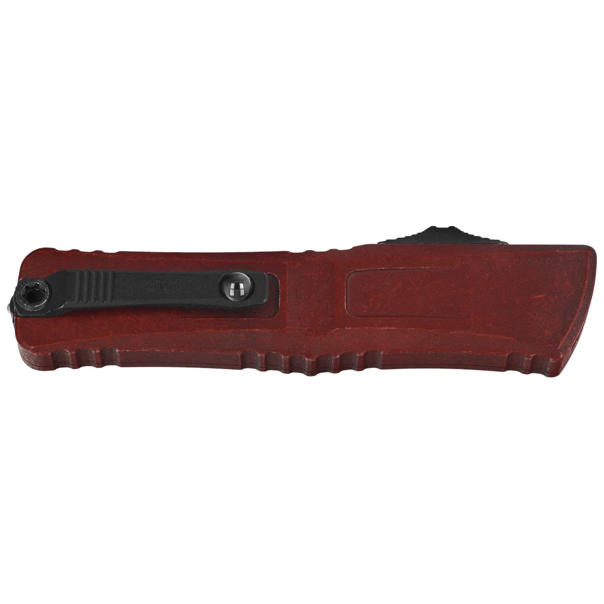 Combat Troodon Gen III S/E Cerakote Weathered Crimson Aluminum, Cerakote Weathered Crimson this largest of the automatic knives is the pinnacle of precision engineering and tactical prowess in OTF (Out The Front) knives. Built for a wide range of utility applications, it boasts a 25% larger size compared to the flagship Troodon. Precisely crafted, it features a sophisticated and hellishly fast mechanism that extends the razor-sharp blade. 100% made and assembled in the USA. Designed by Anthony Marfione, knifemaker and owner of Microtech Knives.