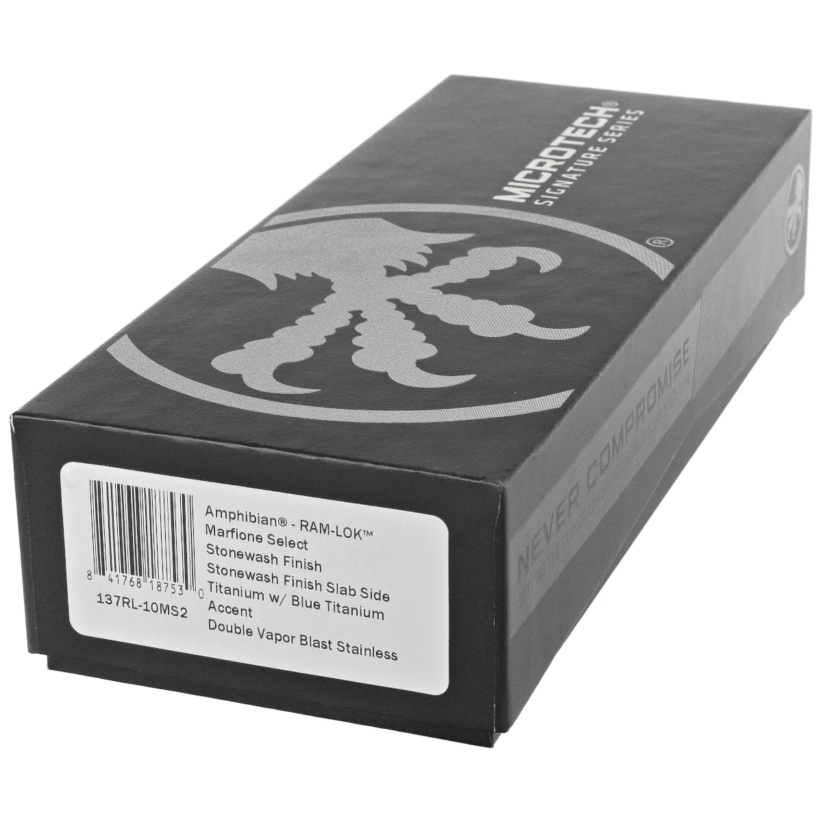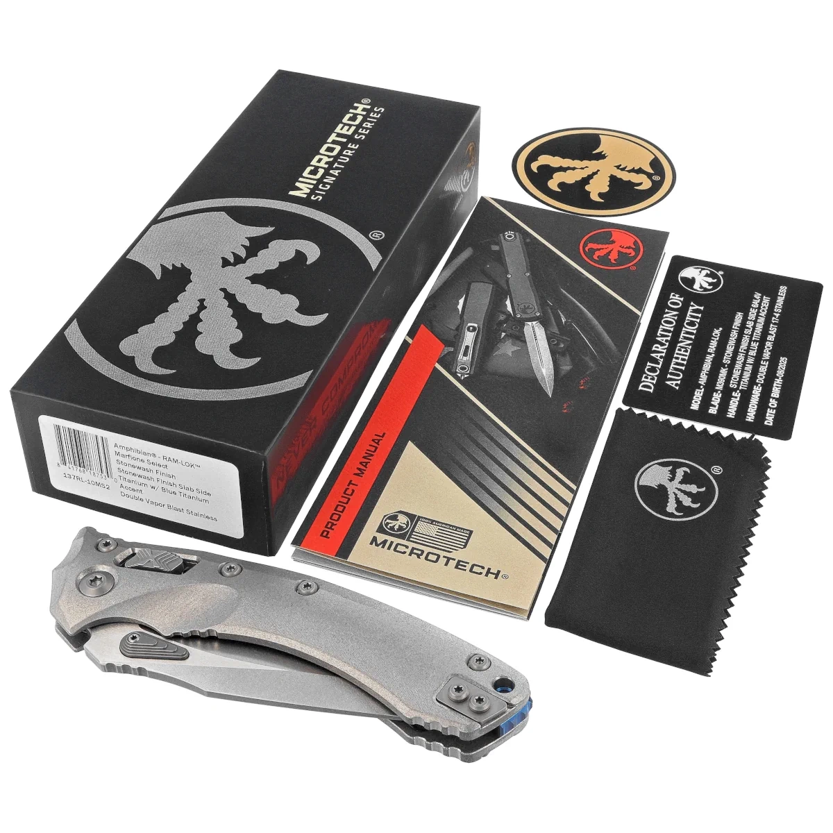 - Marfione Select Amphibian Ram-Lok S/E Stonewashed Gray Titanium, Stonewashed reissue of folding knife with intuitive RAM-Lock. Superior M390MK blade steel, the result of collaboration between Microtech and Bohler engineers. Ergonomic titanium handle.
