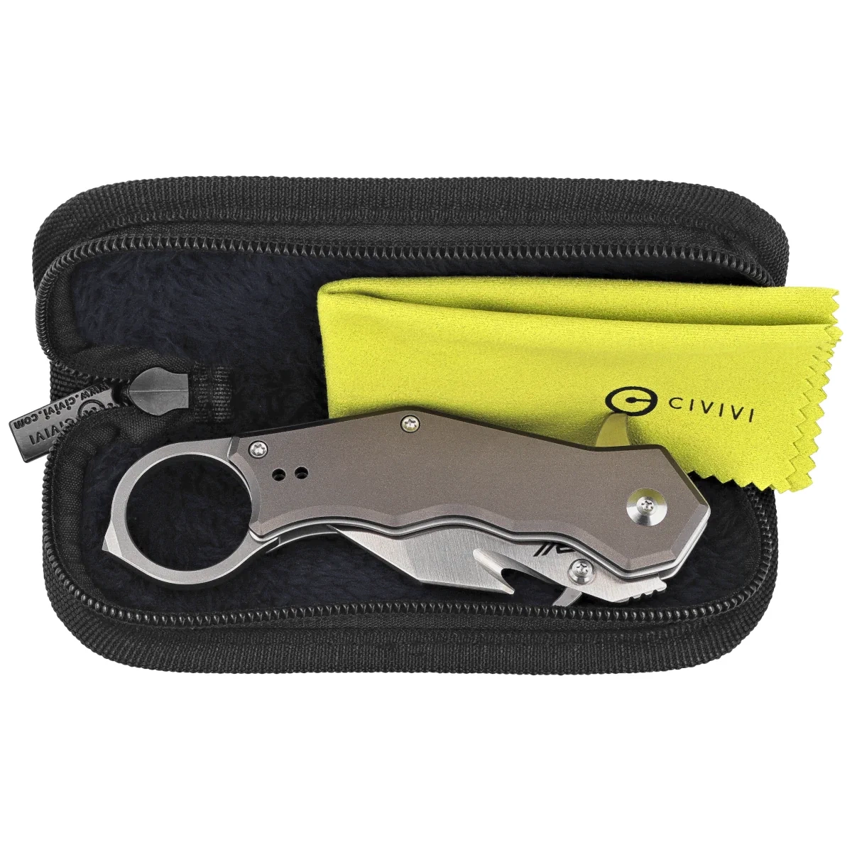 - Civivi Amaroq Gray Aluminum, Satin - a folding karambit designed by Tony Sentmanat. Nitro-V steel blade, milled aluminum Handle with grip ring, button lock, quick flipper and thumb stud opening.