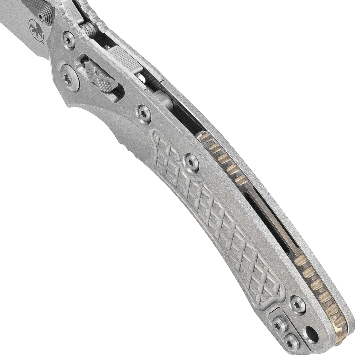 Handle - made of durable titanium, for a better grip covered with a characteristic texture imitating the surface of a fragmentation grenade(Frag Pattern). Wide locking slide with Microtech's characteristic stepped X structure . Both facings are bolted together with a solid titanium backspacer in bronze. A double-sided (right/left) titanium clip allows the knife to be carried discreetly in tip-up position. Above the clip a lanyard hole, a place for a safety or decorative cord.