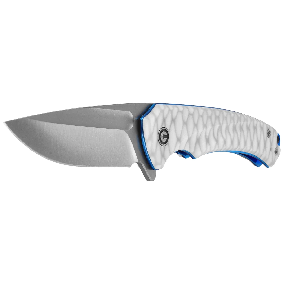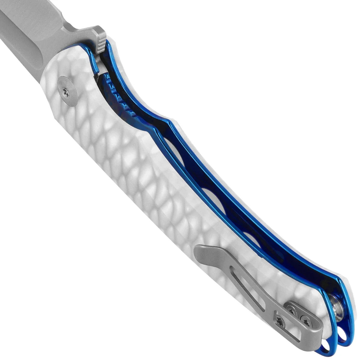 Handle - made of white-gray resin is characterized by excellent mechanical strength and light weight. Its texture improves grip, and the ergonomic profile with cutouts facilitates precise control of the knife in any hand position. Internal steel liners increase the rigidity of the design, and the liner lock ensures safety and reliability in everyday use. Also noteworthy are the reptile shell-like finish details, which enhance the aesthetics of the model, giving it a subtle, collectible touch. A deep-carry clip allows for low-profile carry, while a lanyard hole enhances functionality in off-road conditions. The whole creates a perfectly balanced EDC tool with exceptional aesthetics.