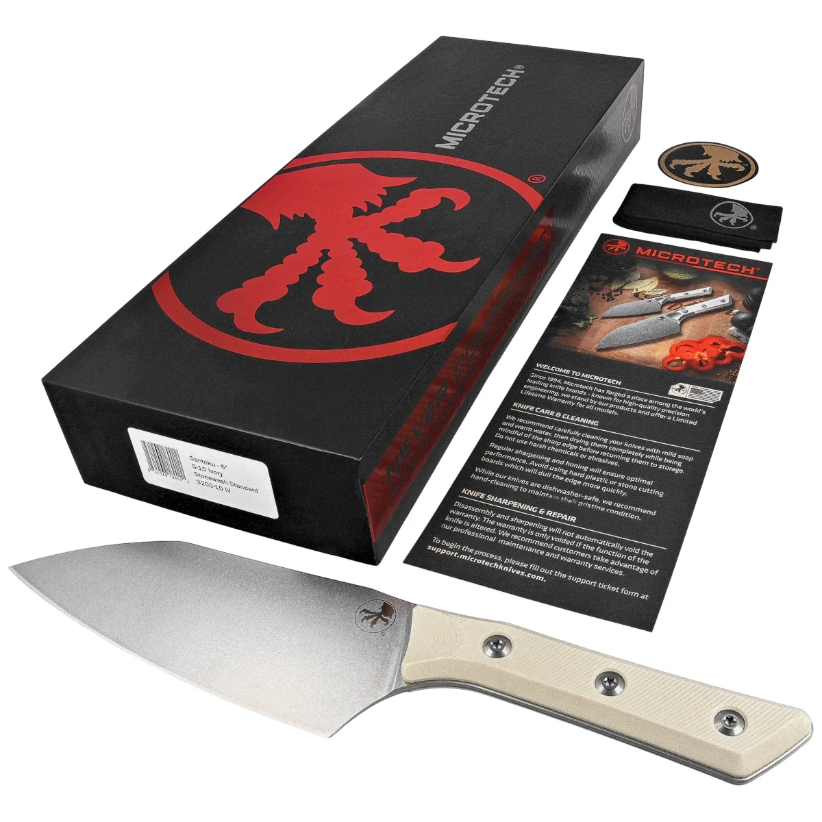 326,22 €Santoku 6" Ivory G10, Stonewashed is a modern interpretation of the traditional kitchen knife by one of the most respected American knife brands. Created in the spirit of technical perfection and utilitarian minimalism, it is the perfect tool for professional chefs and enthusiasts of precision cutting. The distinctive silhouette of the santoku is enhanced here with high-end materials and ergonomics refined to perfection. Blade made of advanced M390MK steel offers excellent sharpness retention, full corrosion resistance and microstructure stability, even under heavy use. Its stonewashed finish gives the surface a matte texture that effectively masks traces of use and adds a professional, working character to the blade . With its santoku profile, the knife successfully performs the tasks of portioning, slicing and chopping, while maintaining smooth operation and precise blade guidance. The handle is made of durable G10 composite, a material resistant to moisture, temperature and mechanical factors. Subtle milling improves the grip, and the minimalist geometry of the handle provides stable support for the hand - regardless of the intensity of work. Mounting elements in the form of torx screws increase the rigidity of the design and allow easy disassembly for maintenance. Thanks to the perfectly balanced combination of ergonomics, durability and modern design, the Santoku model from Microtech is perfect both in the professional kitchen and in the hands of the home user who does not consider compromising on quality. The included protective blade guard allows for safe storage and transportation. This is a knife that not only meets expectations - he redefines them.