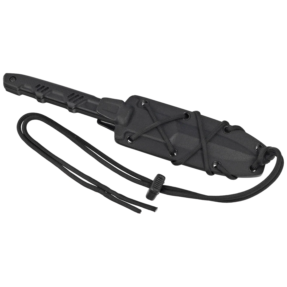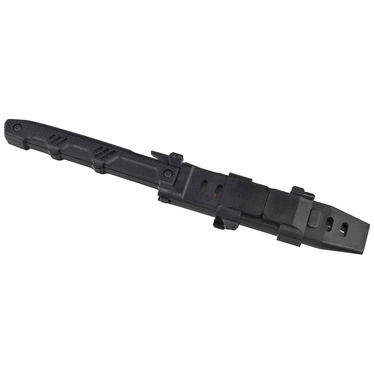 Sheath - in designing the knife for professional use, great emphasis was placed on ease of handling, access and retrieval. The knife is attached to the tactical sheath with a quick-release fuse(snap), which can be easily reversed allowing the holster to be adjusted for both right and left-handed users. The trigger-like snap allows for quick, instinctive knife extraction and keeps the knife from falling out. The openwork holster makes it easy to dry the blade. A system of two adjustable multi-position clamps allows quick attachment of the Sheath under the straps of the M.O.L.L.E. system. We also include a second sheath suitable for EDC applications, made of kydex.