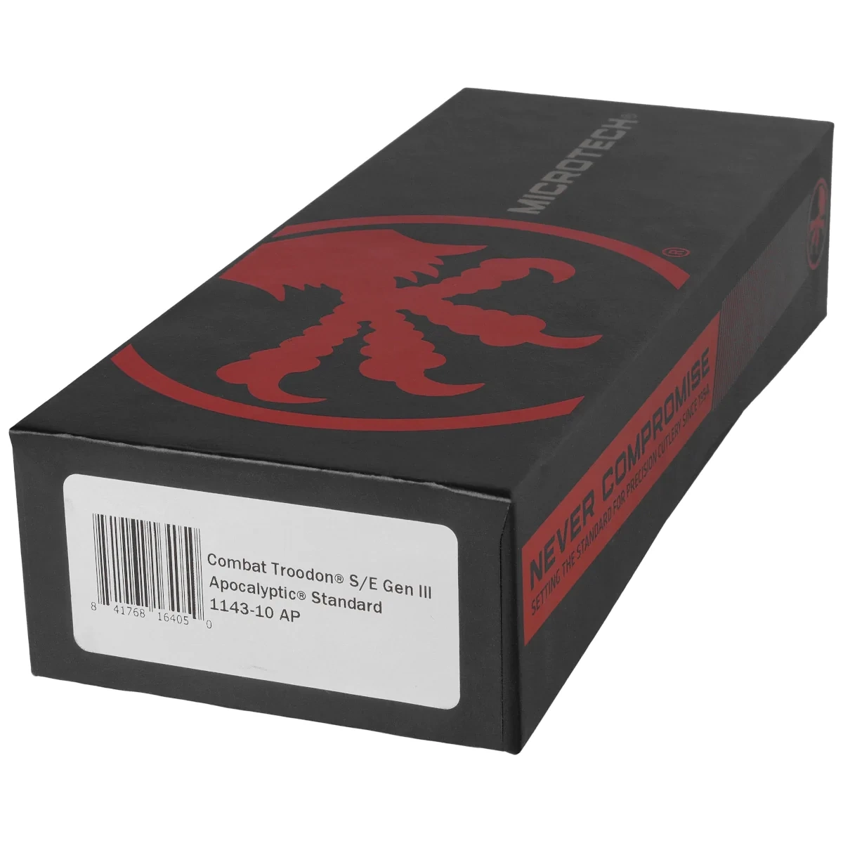 Combat Troodon Gen III S/E Black Aluminum, Apocalyptic this largest of the automatic knives is the pinnacle of precision engineering and tactical prowess in the field of OTF (Out The Front) knives. Built for a wide range of utility applications, it boasts a 25% larger size compared to the flagship Troodon. Precisely crafted, it features a sophisticated and hellishly fast mechanism that extends the razor-sharp blade. 100% made and assembled in the USA. Designed by Anthony Marfione, knifemaker and owner of Microtech Knives.