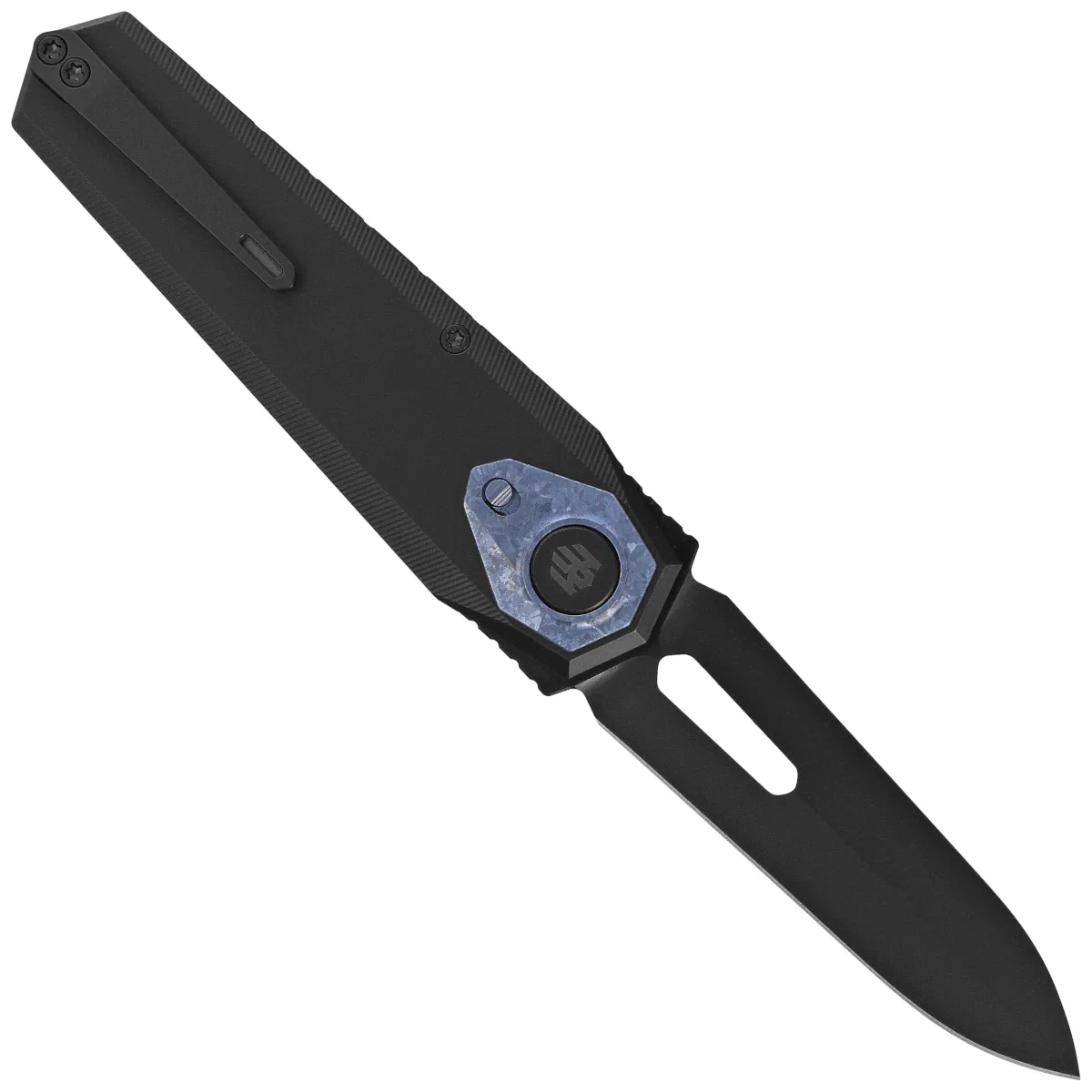 Handle - made of black DLC-coated titanium 6AL-4V stands out for its minimalist design and balanced construction, providing ergonomics, durability and low weight. The milled lines increase grip and add technical character, while the precision-curved edges take care of grip comfort. A decorative inlay around the pivot highlights the workmanship detail, combining aesthetic value with custom design symbolism. The button liner lock guarantees rigidity and safety in use, while the deep carry clip allows you to carry the knife comfortably in your pocket. There is also a lanyard hole on the back of the backspacer - a practical element for increased portability and personalization.