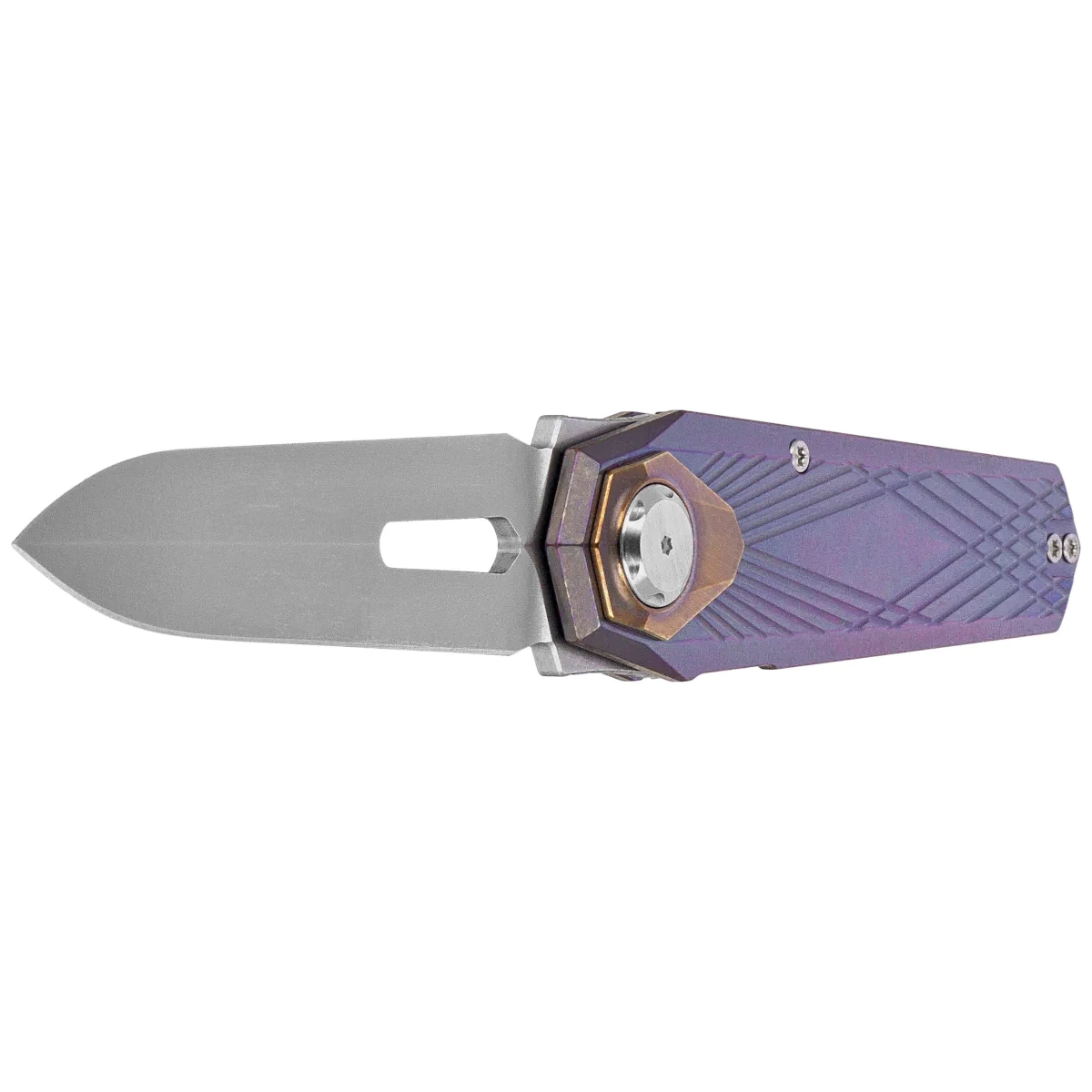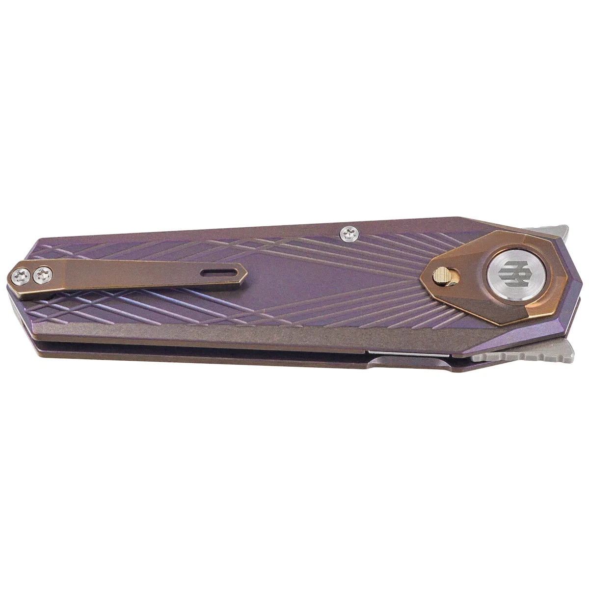 Handle - made of titanium 6AL-4V is distinguished by its minimalist design and balanced construction, providing ergonomics, durability and low weight. The milled lines increase grip and add technical character, while the precisely rounded edges take care of grip comfort. A decorative inlay around the pivot highlights the workmanship detail, combining aesthetic value with custom design symbolism. The button liner lock guarantees rigidity and safety in use, while the deep carry clip allows you to carry the knife comfortably in your pocket. There is also a lanyard hole on the back of the backspacer - a practical element for increased portability and personalization.