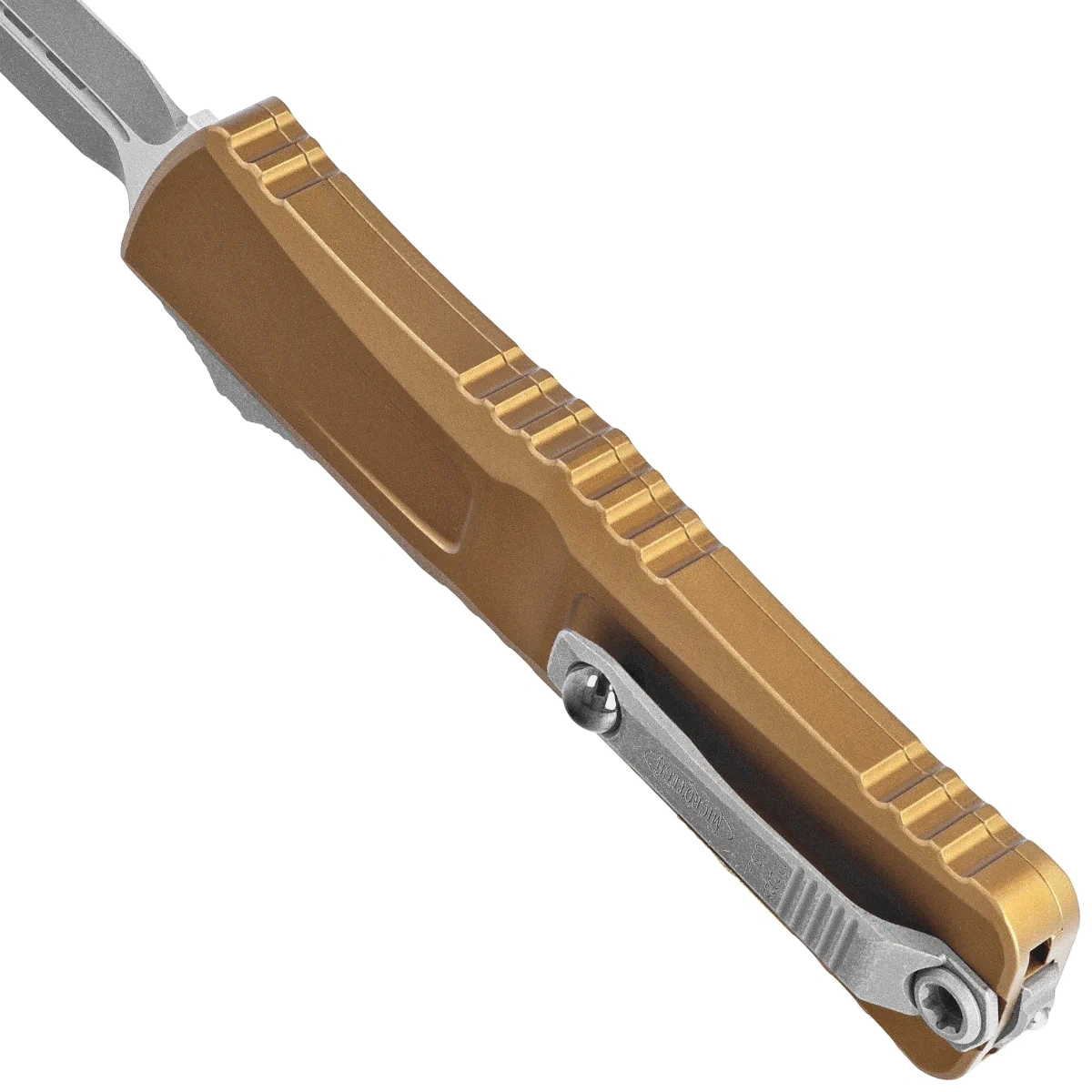 Handle - made with excellent precision in 3D technology on CNC milling machines, from Mil-Spec coated aluminum 6061-T6. The surface texture of the Handle and the deep notches (jimping) on it make the knife non-slip in the hand during use. The slim profile and milled two-position (right/left) solid deep-carry clip allow the knife to be carried discreetly in the pocket, in tip-down (blade tip down) position. Equipped with a smooth rollerball, which allows the knife to slide easily into the pocket without damaging the pocket edges. The clip bears the Microtech logo and production date. The Handle is finished with glass breaker, a steel triangle, into which a tungsten carbide ball has been pressed.