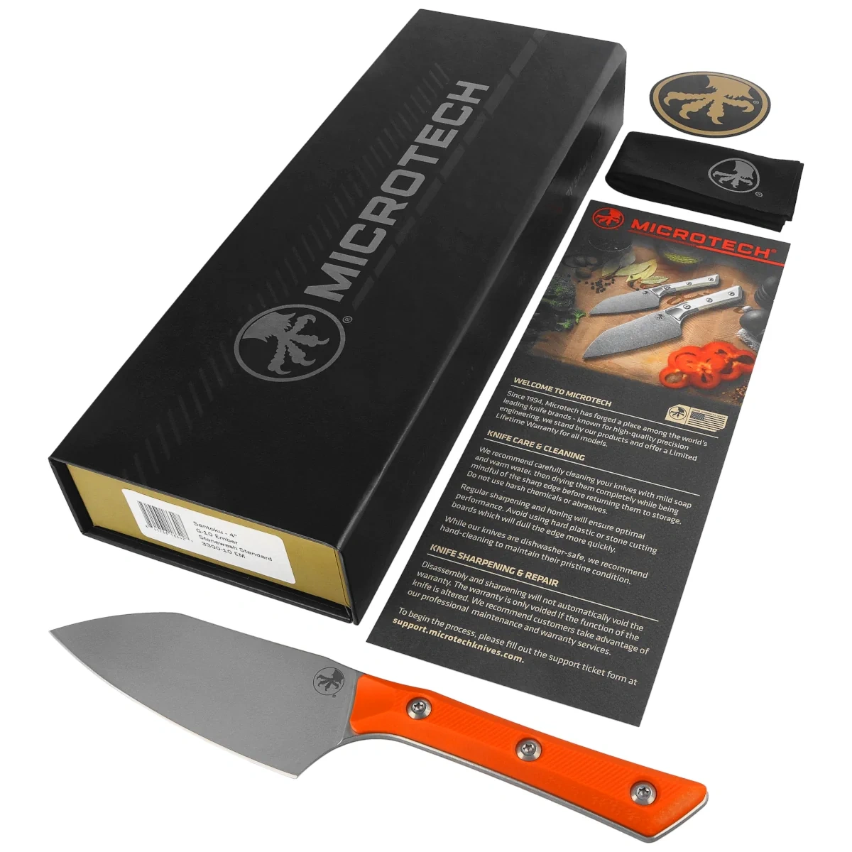 The 4.2" Ember G10 Santoku, Stonewashed is a modern interpretation of the traditional kitchen knife by one of America's most respected knife brands. Created in the spirit of technical perfection and utilitarian minimalism, it is the perfect tool for professional chefs and enthusiasts of precision cutting. The distinctive santoku silhouette is enhanced here with high-end materials and ergonomics refined to perfection. Blade made of advanced M390MK steel offers excellent sharpness retention, full corrosion resistance and microstructure stability, even under heavy use. Its stonewashed finish gives the surface a matte texture that effectively masks traces of use and adds a professional, working character to the blade . With its santoku profile, the knife successfully performs the tasks of portioning, slicing and chopping, while maintaining smooth operation and precise blade guidance. The handle is made of durable G10 composite, a material resistant to moisture, temperature and mechanical factors. Subtle milling improves the grip, and the minimalist geometry of the handle provides stable support for the hand - regardless of the intensity of work. Mounting elements in the form of torx screws increase the rigidity of the design and allow easy disassembly for maintenance. Thanks to the perfectly balanced combination of ergonomics, durability and modern design, the Santoku model from Microtech is perfect both in the professional kitchen and in the hands of the home user who does not consider compromising on quality. The included protective blade guard allows for safe storage and transportation. This is a knife that not only meets expectations - he redefines them.
