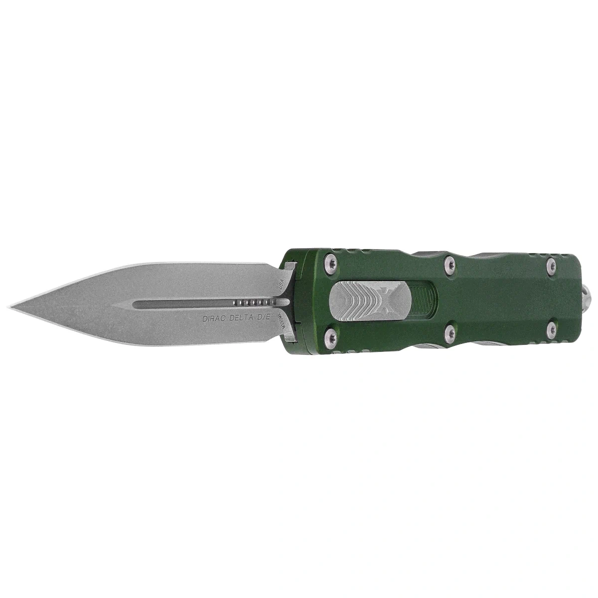 Dirac Delta D/E Emerald Green Aluminum, Apocalyptic is an enlarged OTF automatic knife from the Dirac series. Operating in D/A mode , it features a hellishly fast blade extension mechanism. Slider button on the side of the handle. 100% made and assembled in the USA. Designed by Anthony Marfione, knifemaker and owner of Microtech Knives.