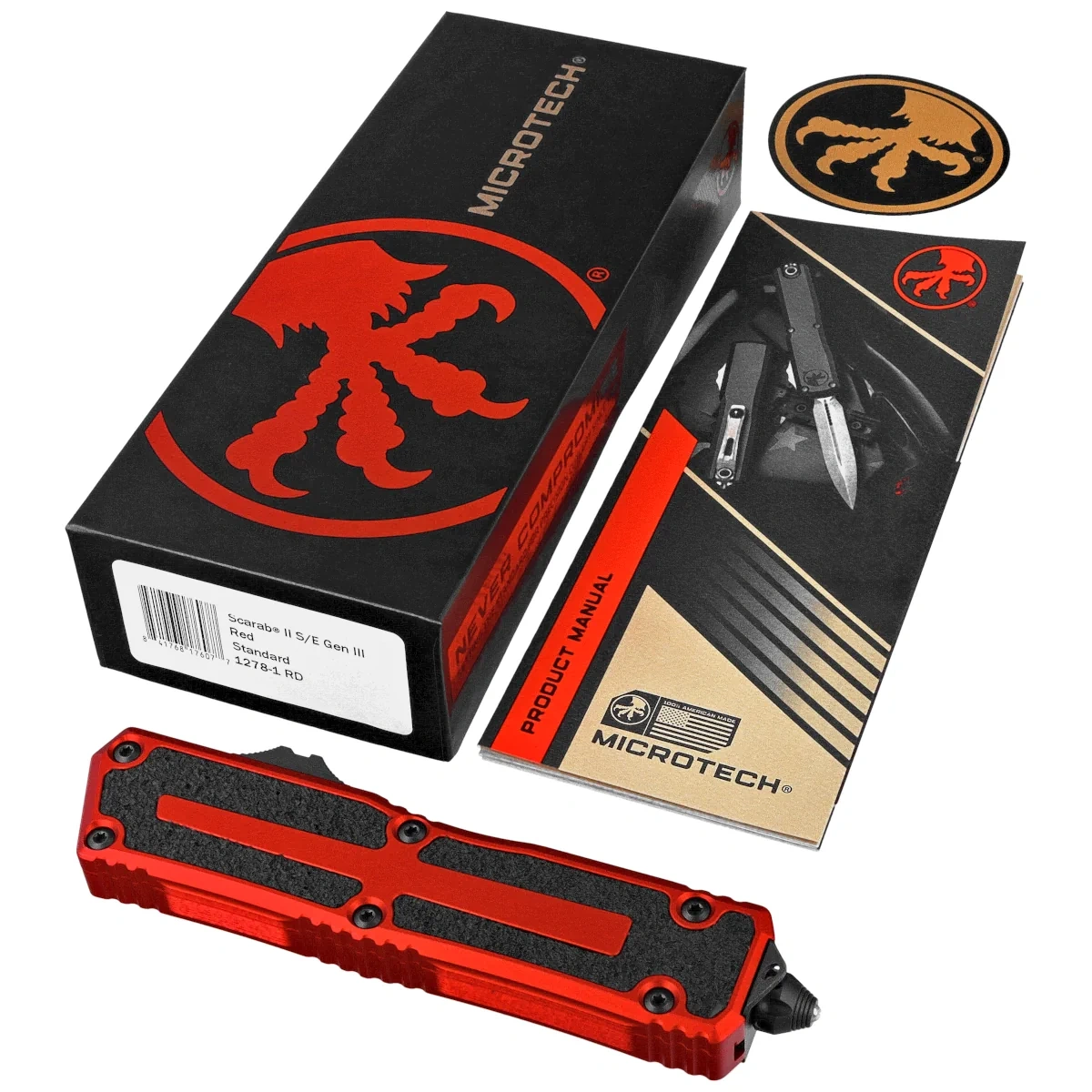 Scarab II Gen III S/E Red Aluminum, Black is the pinnacle of excellence in automatic tactical knives, drawing inspiration from the original Microtech Ultratech design. Built to withstand the toughest conditions, the new Scarab II is the ultimate choice for heavy use. While retaining the styling features of its predecessor, it sets a new standard for OTF (Out The Front) technology.