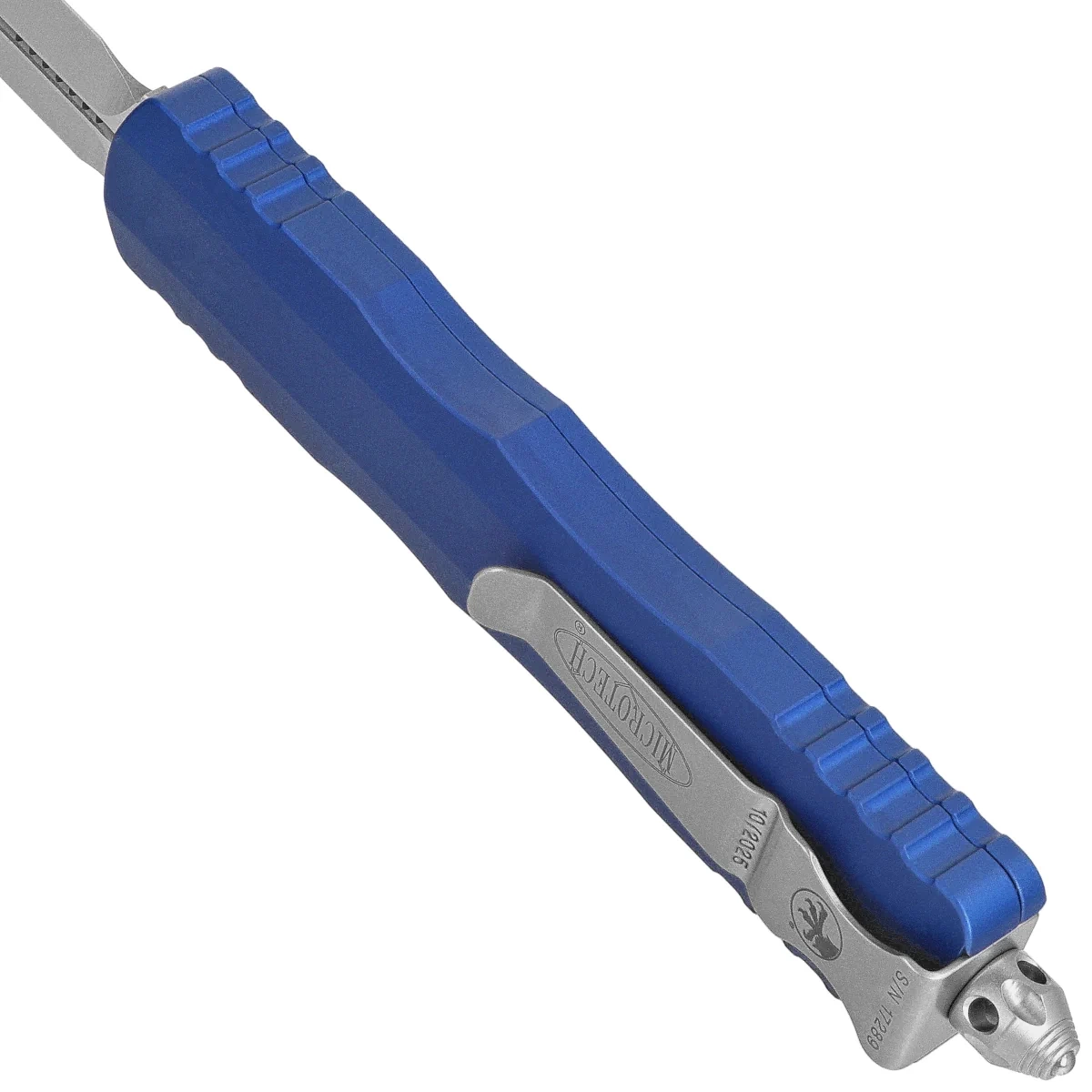 Handle - made with excellent precision in 3D technology on CNC milling machines, from Mil-Spec coated aluminum 6061-T6. The surface texture of the Handle makes the knife non-slip in the hand during use. There are notches (jimping) on the back and bottom of the handle for a more secure grip. A distinctive feature is the location of the slider, in a recess milled into the side of the handle. This allows the hand to lay more naturally when opening and closing the knife. The slim profile and the milled two-position (right/left) solid deep-carry clip allow the knife to be carried discreetly in the pocket, in tip-down (blade tip down) position. The clip bears the Microtech logo, serial number and production date. The Handle is finished with glass breaker, a solid steel triangle, into which a tungsten carbide ball has been pressed.