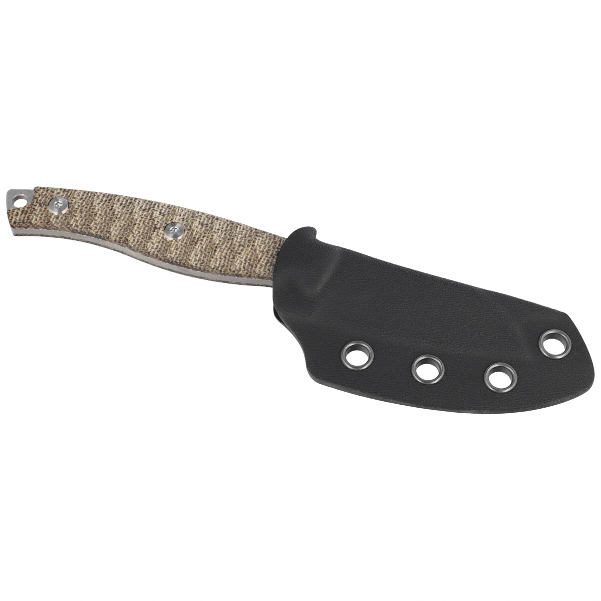 Handle - equipped with aggressively textured Canvas Micarta composite grips , guaranteeing a secure grip in all conditions. Milling improves control and prevents the tool from slipping during use. The ergonomics of the grip have been adapted to different hand positions, allowing confident manipulation for both precision and power tasks. A mounting hole in the back allows you to add a rope or braid, and the included Kydex sheath allows you to comfortably carry the knife on your belt, backpack or other outdoor gear. The entire construction is designed with durability, simplicity and maximum utility in mind - in line with the designer's philosophy.