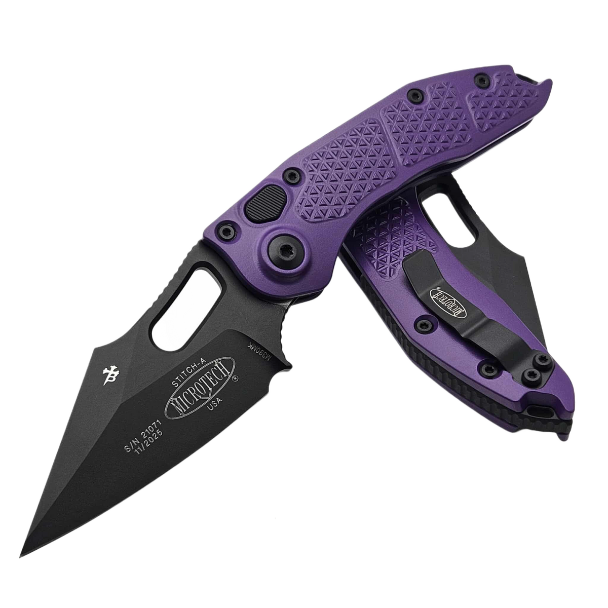 • Stitch-A S/E Tactical Purple Aluminum, Black automatic version of the popular design by Sebastijan Berenjie of Borka Blades and Microtech. Wide harpoon-shaped blade, superior materials and legendary Microtech workmanship!