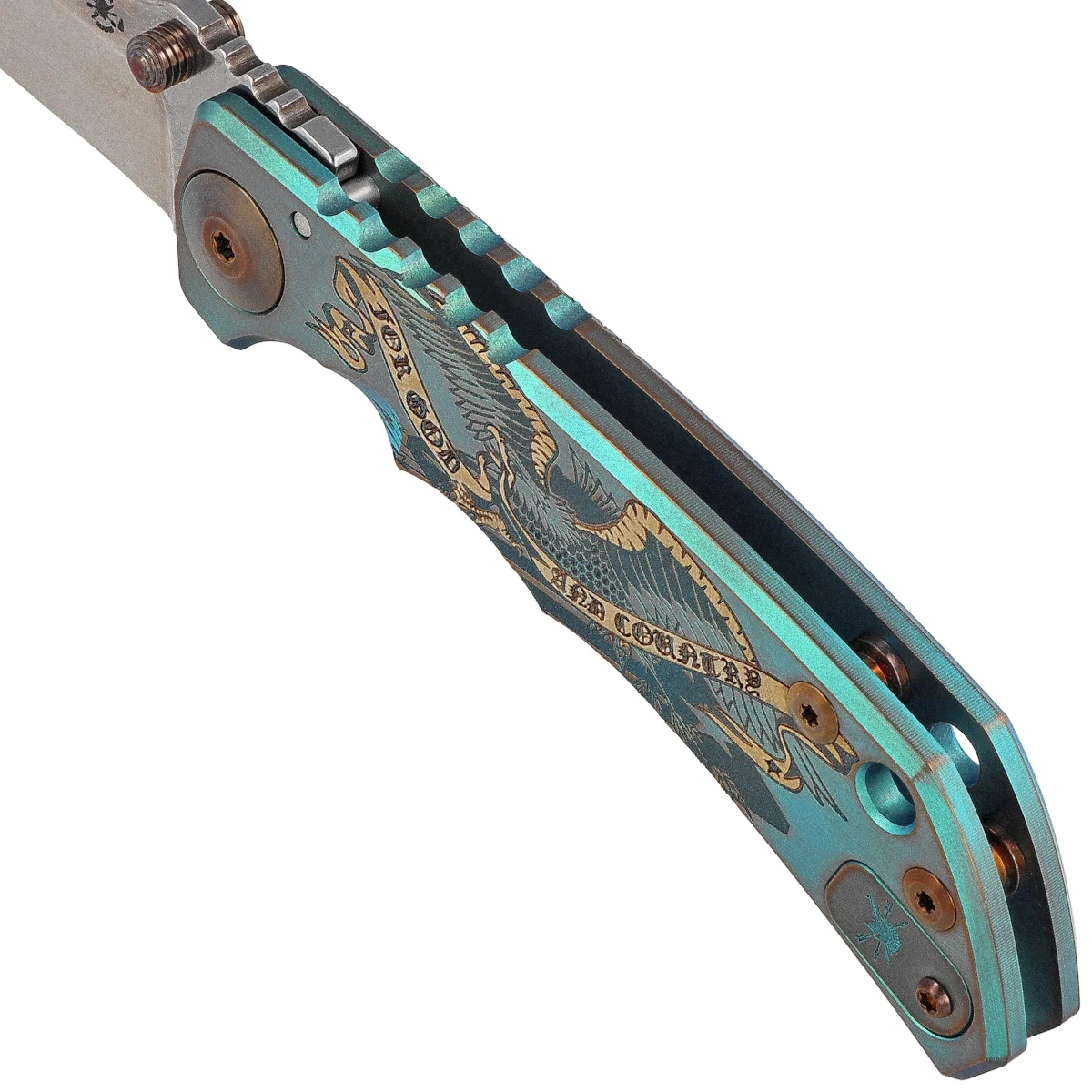 Handle - made of solid titanium 6AL4V has beveled edges of the covers, eliminating sharp points. The surface is decorated with an artistic engraving of “God & Country”. The so-called open-backed design without the typical backspacer, attached to each other with titanium spacer sleeves for easy cleaning. The simple but solid construction guarantees many years of use. There are notches (jimping) on the edges of the Handle, improving grip security. The axis of the pivot is decorated with a designer screw, and all fasteners (screws, clip) are anodized bronze. A double-sided (right/left) titanium clip, decorated with an arrow motif, allows the knife to be carried in tip-up position. Above the clip is a hole designed for threading a safety cord.