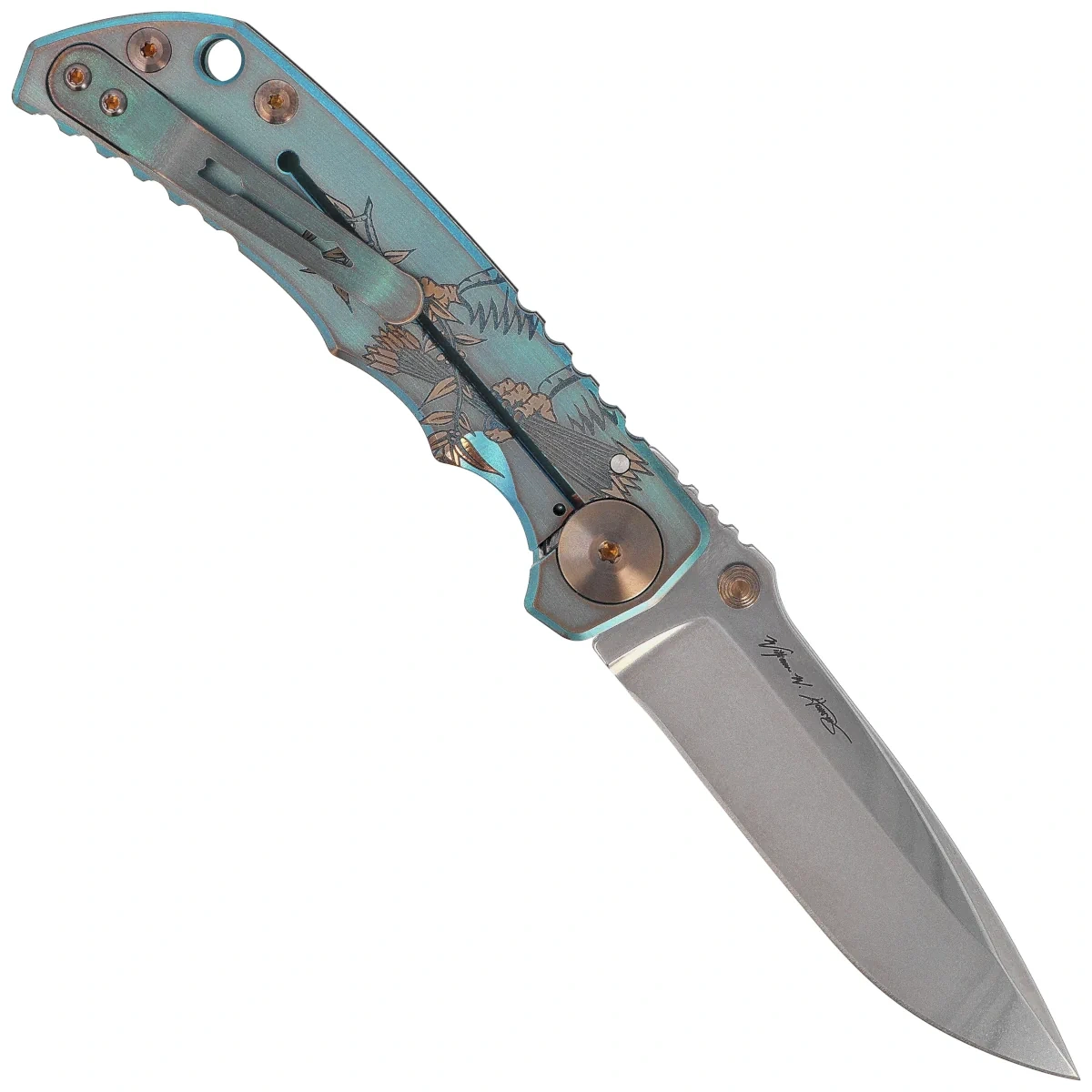 The solid titanium handle is decorated with an artistic engraving of “God & Country”. Thanks to the properly contoured handle, the knife sits securely in the hand, ensuring precision when performing a variety of activities. A robust frame lock mechanism guarantees safe use even in extreme conditions. Each piece is handmade in the USA, making it a valuable and sought-after item among both collectors and discerning users.