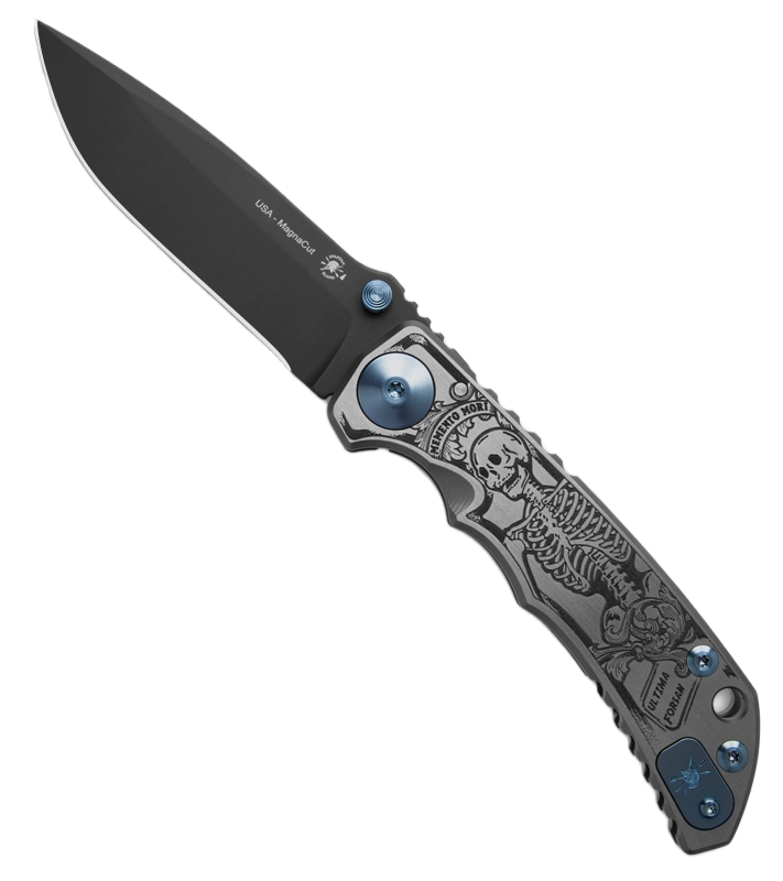 The solid titanium handle is decorated with an artistic engraving of “Memento Mori”. Thanks to the properly contoured handle, the knife sits securely in the hand, ensuring precision when performing a variety of activities. A robust frame lock mechanism guarantees safe use even in extreme conditions. Each piece is handmade in the USA, making it a valuable and sought-after item among both collectors and discerning users.